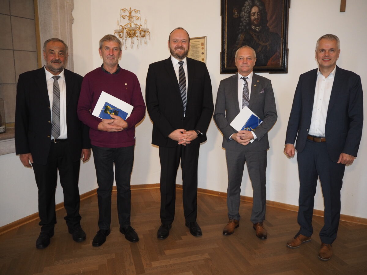 Landrat Andreas Meier konnten beiden Jubilaren die Urkunde des Ministerpräsidenten überreichen und eine entsprechende Anstecknadel anheften. Sowohl Bürgermeister Josef Beimler aus Waldthurn als auch Thomas Meiler aus Flossenbürg freute sich über diese Ehrung ihrer Gemeindebürger und bedankten sich für deren überragendes Engagement.