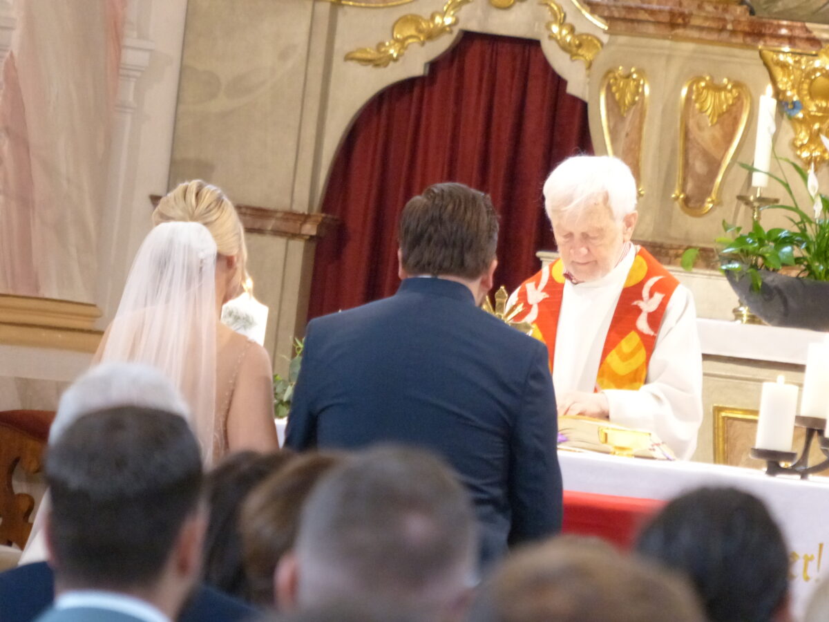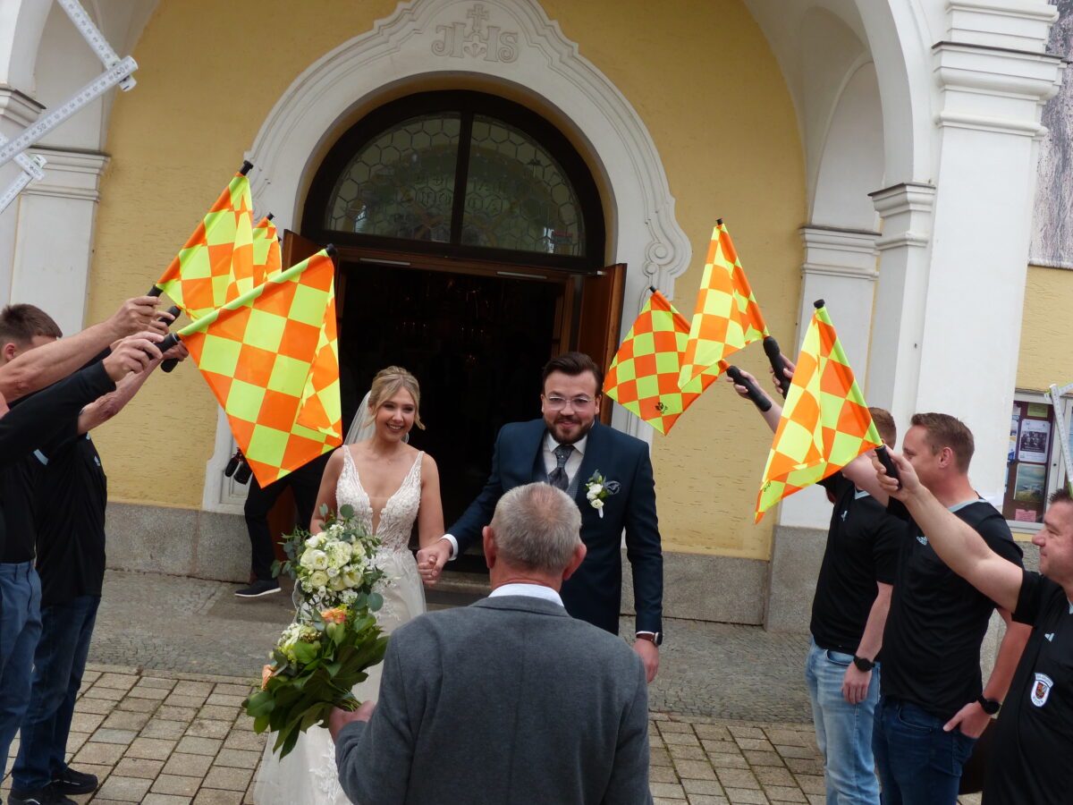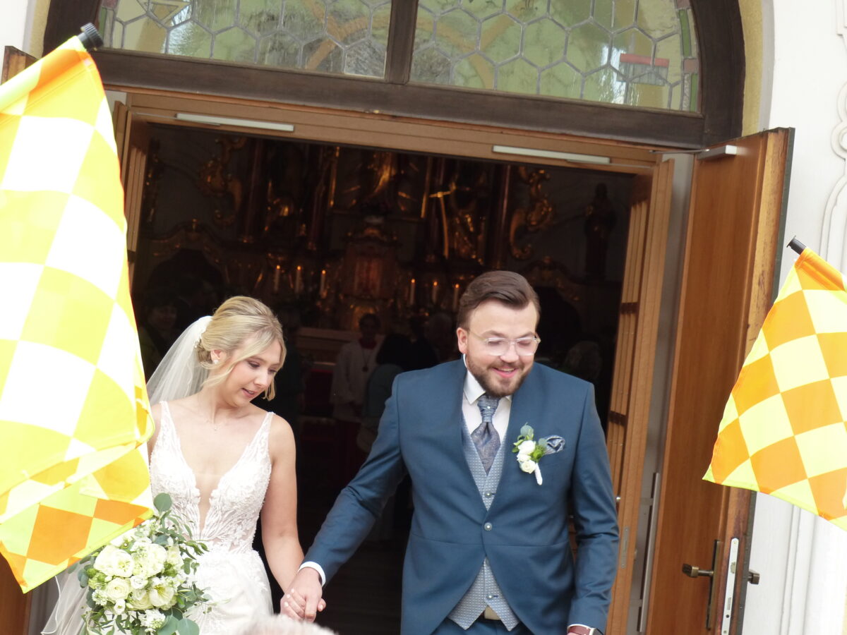 Die Trauung nahm der ehemalige Kohlberger Pfarrer Andreas Schlagenhaufer in Konzelebration mit Pfarrer Varghese Puthenchira vor. Musikalisch wurde der Traugottesdienst vom Kirchenchor und von dem Duo „Lichtfänger“ begleitet. Beim Verlassen der Kirche warteten neben den Schiedsrichtern, Familienmitgliedern, Freunden und viele Kohlberger auch Arbeitskollegen des Bräutigams zum Gratulieren.