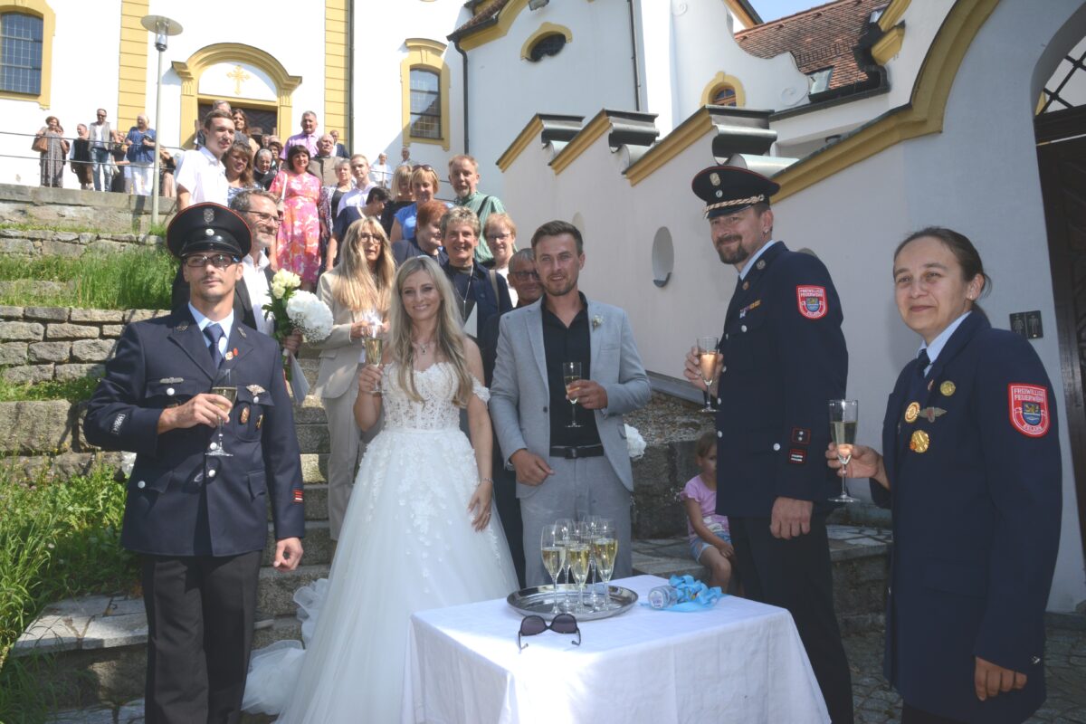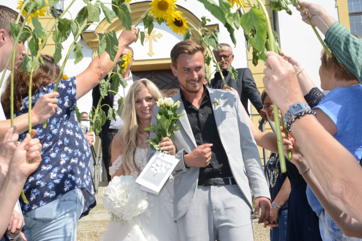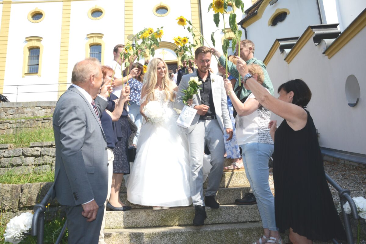 Im Anschluss an die kirchliche Trauung standen Mitarbeiterinnen des Kindergartens St. Elisabeth, Mitglieder des Pfarrgemeinderates und Kolleginnen der Braut aus der Pfarrverwaltung Spalier und ließen das Brautpaar durch einen kleinen Dom mit Sonnenblumen schreiten. Dann überbrachte eine Abordnung der Feuerwehr Eslarn dem Brautpaar seine Glückwünsche. Zur Hochzeitsfeier lud das Brautpaar seine Gäste in die Mühlschleif bei Moosbach ein.