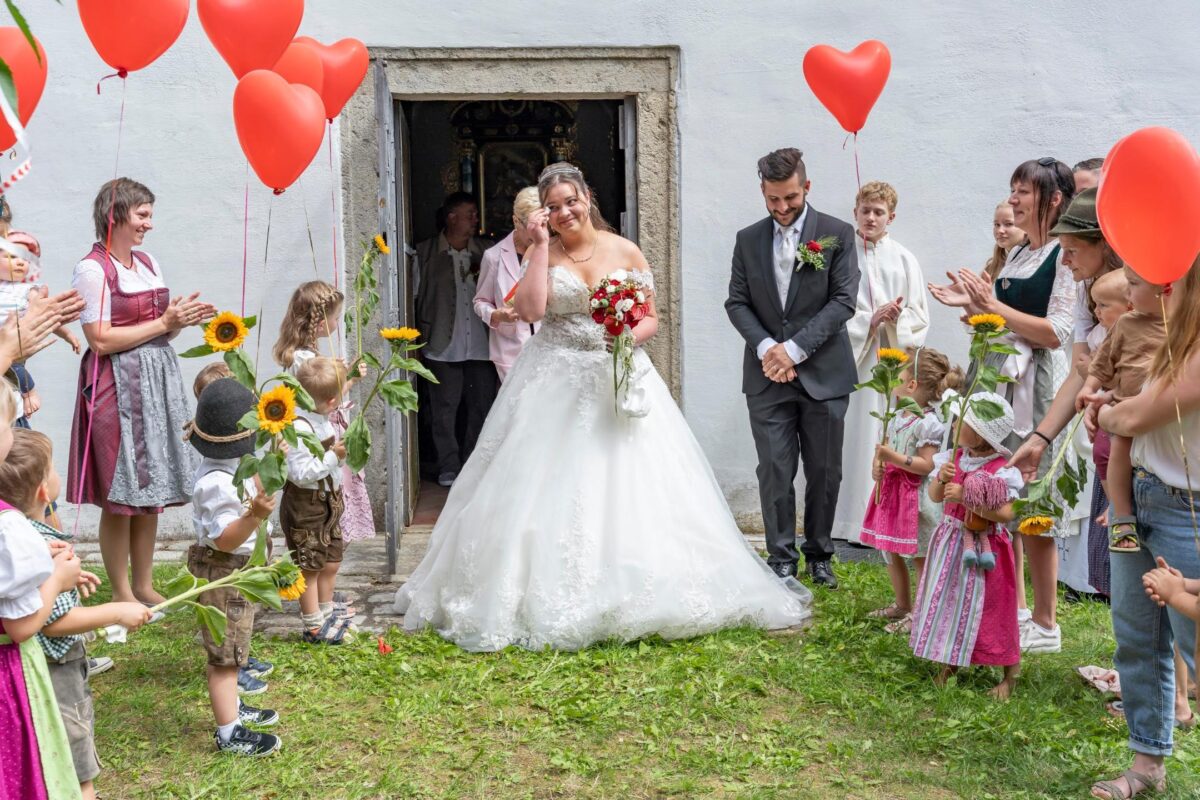 Nach der kirchlichen Trauung wurde das Paar bei herrlichem Sonnenschein bereits von vielen Gratulanten erwartet. Zu Tränen rührte die Braut besonders die junge Gratulantenschar. Gekommen waren „ihre“ Kinder aus der Kleinkindgruppe des Kindergartens Pleystein, die Céline seit einem Jahr als Erzieherin leitet. Die dreijährigen Buben und Mädchen gratulierten in Tracht mit Eltern, Geschwistern und dem Kindergartenpersonal. Sie alle wünschten dem Brautpaar mit vielen Geschenken alles Gute für die Zukunft und ließen rote Herzballons in den blauen Himmel steigen.