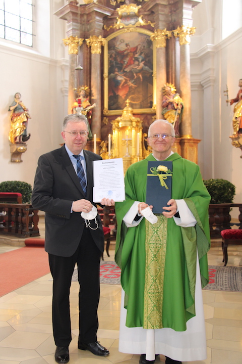 Eine große Freude war es für ihn, seinen Kirchenchor-Dirigenten, Organisten und Kantor Harald Bäumler für 30 Jahre zuverlässigen Dienst zu ehren. Er lobte dessen außerordentlich großen Einsatz, sein fachliches Können und seine Kompetenz, mit der er maßgeblich an der großen Reputation des Chores Anteil hat. Häring überreichte im Namen der gesamten Pfarrgemeinde, des Pfarrgemeinderates und der Kirchenverwaltung eine Dankurkunde.