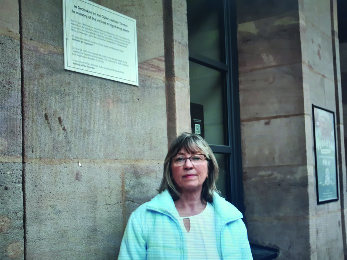Unter dem Titel „Das Oxner-Attentat 1982 in Nürnberg“ berichtet Brigitte Williams, die Witwe des ermordeten William Thomas Schenck jr., im Gespräch mit der Rechtsextremismus-Expertin Birgit Mair über ihre persönlichen Erfahrungen. Der Neonazi Helmut Oxner hatte am 24. Juni 1982 in der Nürnberger Disco „Twenty Five“ drei Menschen aus rassistischen Motiven erschossen und mehrere verletzt.