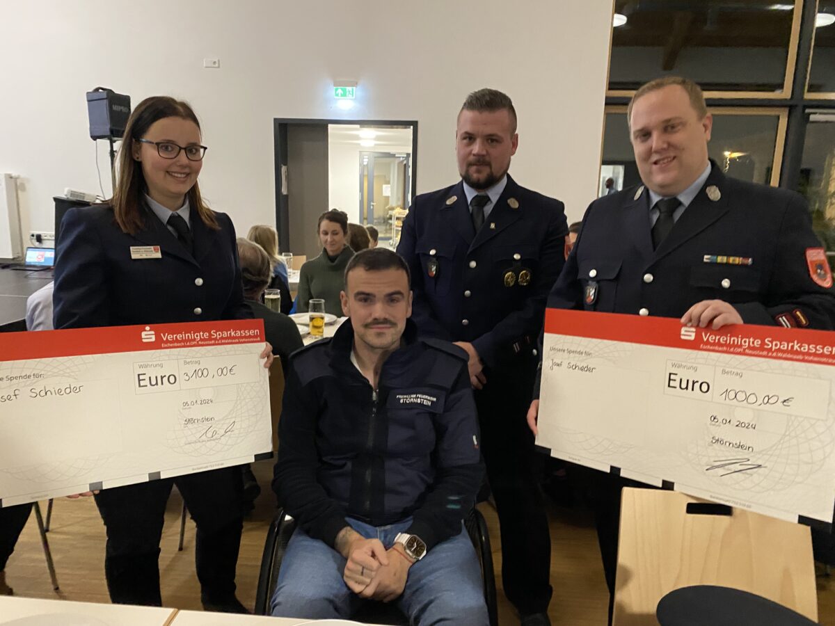 Anfang Januar 2024 haben die Neustädter Kommandanten ihrem Kameraden Josef Schieder die Spende in Höhe von 1000 Euro persönlich übergeben. Gleichzeitig überreichten die Jugendwartinnen der Feuerwehren Neustadt und Störnstein die Spende in Höhe von 3100 Euro aus dem Christbaumverkauf der beiden Jugendfeuerwehren, die ebenfalls Schieder zugutekommt. „Das ist Kameradschaft“, betont Lang, „wir sind vor allem im letzten Jahr sehr zusammen gewachsen und froh, dass wir uns immer wieder gegenseitig unterstützen“.