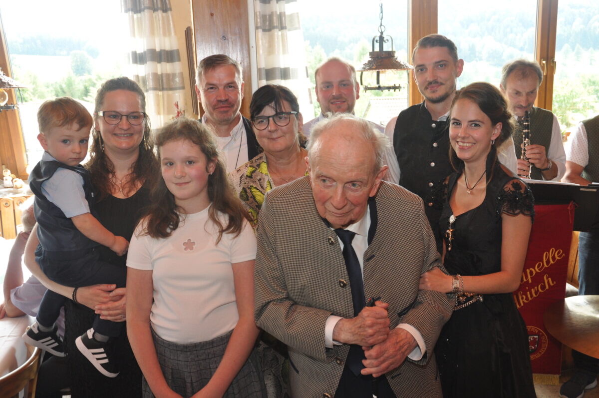 „Du hast oft gesagt, dass du aus deinem Kraftwerk immer wieder Wasser nach Peugenhammer schickst und von uns nichts zurückkommt“, merkte Lang lächelnd an. Zum Neunzigsten gab es nun endlich die „Revanche“, als Heinle aus Langs Händen einen Kübel Zottbachwasser in Empfang nahm. Für die Dorfgemeinschaft Galsterlohe gratulierte Hermann Plödt, musikalisch schließlich die Blaskapelle Waldkirch, darunter mit dem „Egerländer Geburtstagsmarsch“ von Ernst Mosch.