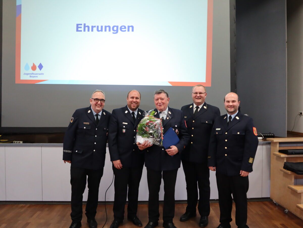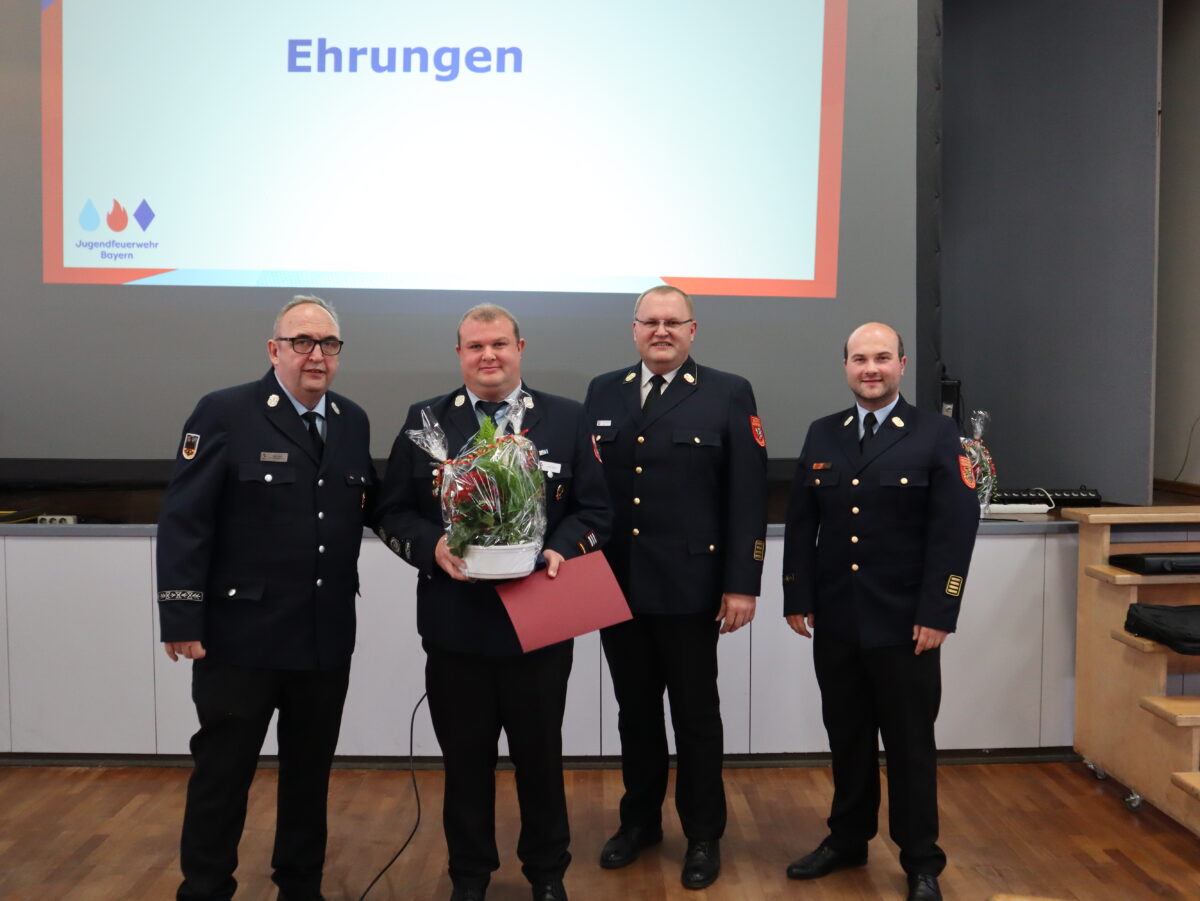 Peter Stahl bat den Bezirksverbandsvorsitzenden KBR Jürgen Kohl und dessen Stellvertreter Marco Saller zu sich nach vorne. Ebenfalls nach vorne bat er Kreisjugendwart KBM Fabian Kaptein. Dieser wurde für seine Verdienste mit der Ehrennadel der Bayerischen Jugendfeuerwehr in Silber ausgezeichnet.
