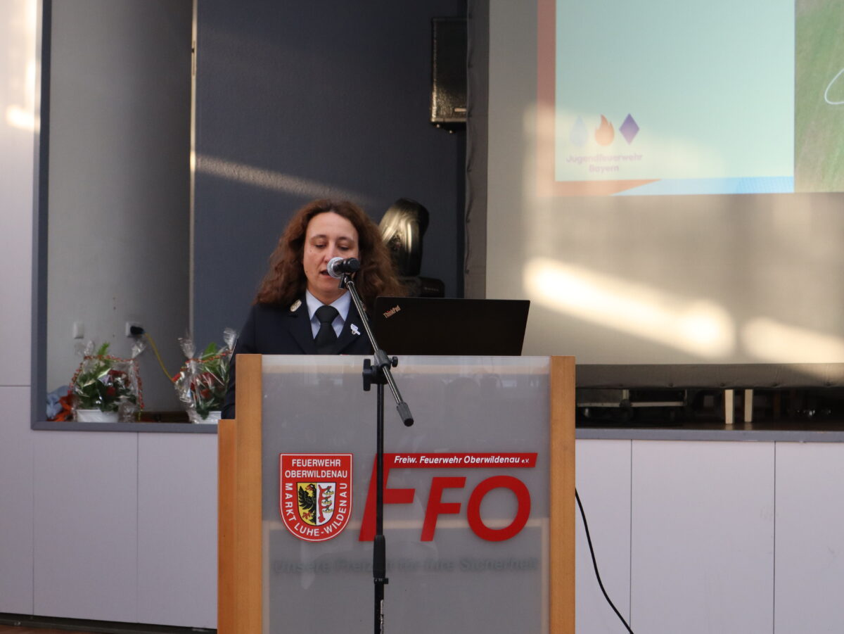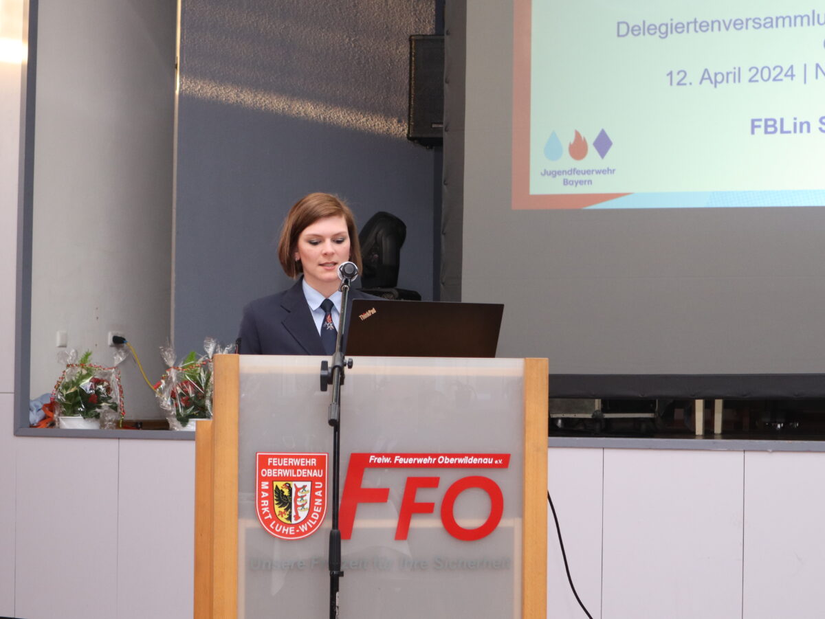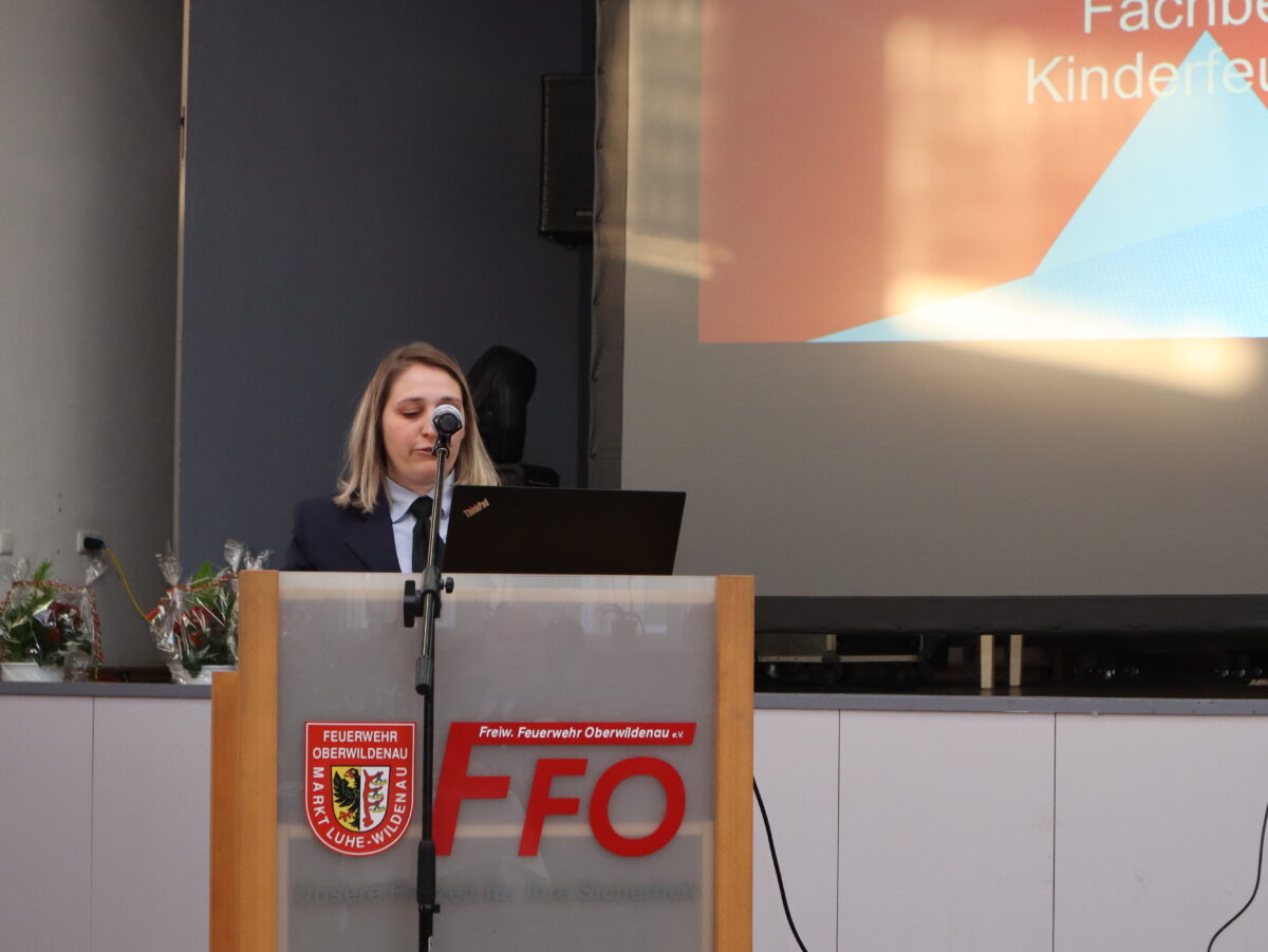 Den Jahresbericht aus dem Fachbereich Kinderfeuerwehr gab Fachbereichsleiterin Julia Wolfram. So stieg gegenüber 2022 die Anzahl der Kinderfeuerwehrgruppen um 36 auf 240, die Anzahl der Betreuer erhöhte sich um 282 auf 1214 und die Anzahl der Mitglieder stieg um 1039 auf 5177. Insgesamt 108 Kinder absolvierten die Kinderflamme. Sie wies darauf hin, dass zukünftige Gründungen einer Kinderfeuerwehr über die Homepage jf-bayern.de getätigt werden sollen.