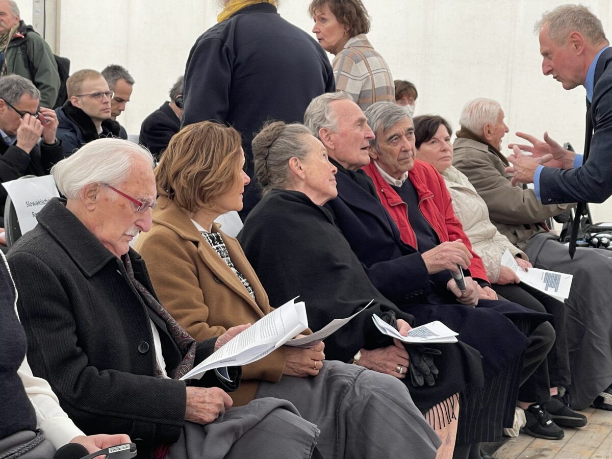 Die Überlebenden Leon Weintraub (98) aus Stockholm, Leszek Zukowski (95) aus Warschau und Josef Salomonovic (85) aus Wien sowie Herzog Max in Bayern sitzen beim Gedenkakt in der ersten Reihe (87). Der Platz des fünften ehemaligen Häftlings Martin Hecht aus Israel bleibt leer: Der Flug des 93-Jährigen und seiner Frau war nach den iranischen Angriffen gecancelt worden. Einige Angehörige sind da, sie hatten einen früheren Flug genommen bzw. kamen aus New York.
