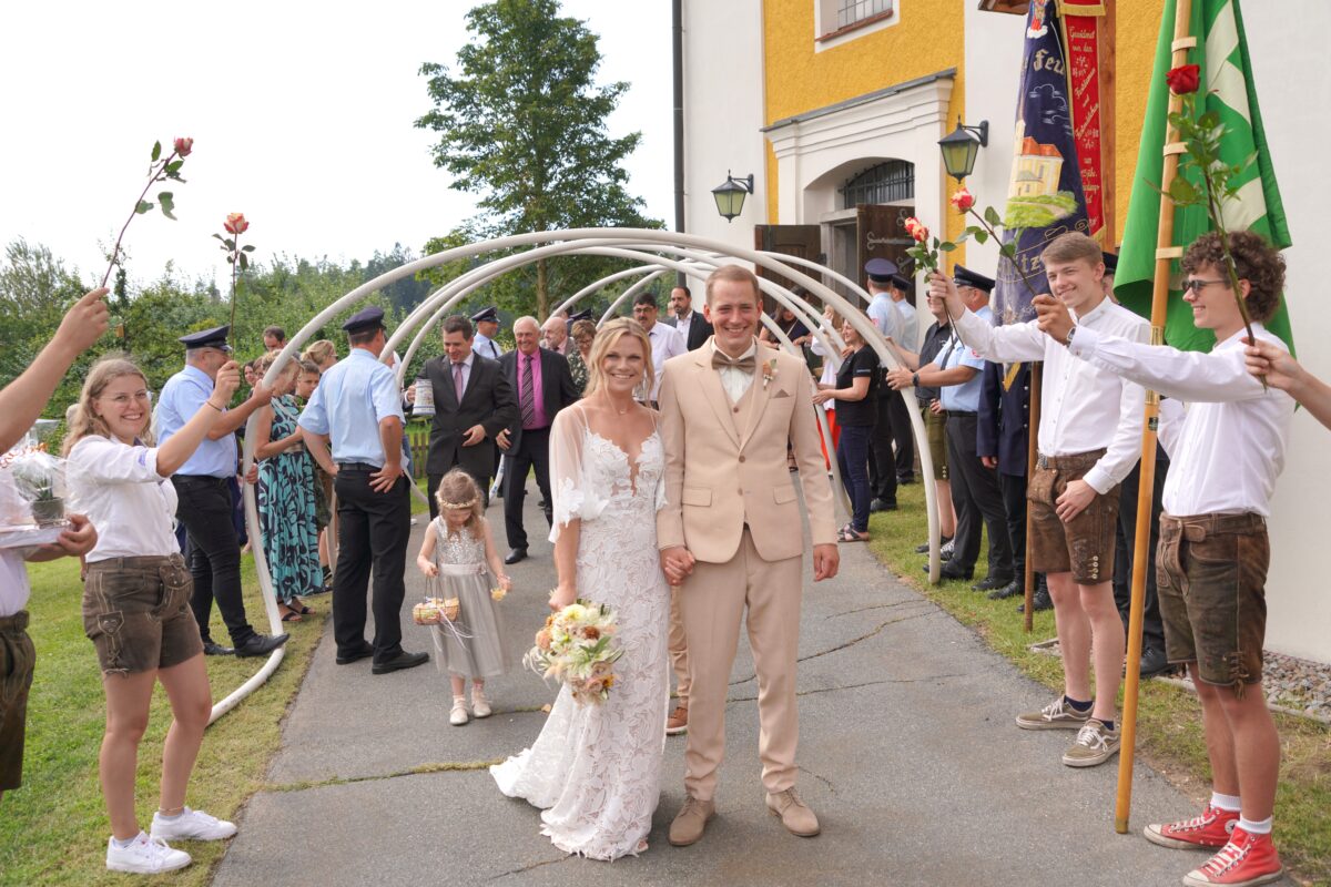 Bereits im April 2024 traute der Trausnitzer Bürgermeister Martin Schwandner das Paar auf der Burg Trausnitz. Die Braut ist Ergotherapeutin, ihr Bräutigam Ingenieur. Nur einen Steinwurf entfernt von der Hochzeitskirche haben sie sich ein Haus gebaut. Kennen- und lieben-gelernt haben sie sich beim Feuerwehrfest in Michldorf im Jahr 2017. Franziska war mit den Waldthurner Festdamen im Bus angereist und Markus mit seinen Freunden im Auto nach Michldorf gekommen. In der Festbar kamen sie sich näher.