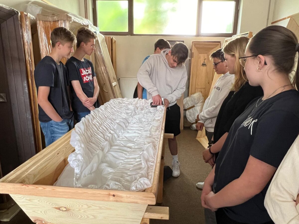 Neben einer Führung durch die verschiedenen Räumlichkeiten wurden die Jugendlichen auch mit den praktischen Aufgaben des Berufs eines Bestatters konfrontiert. Zudem wurden die unterschiedlichen Urnen, Särge und Grabschmuckmöglichkeiten erläutert und abschließend die Fragen der Schüler beantwortet.