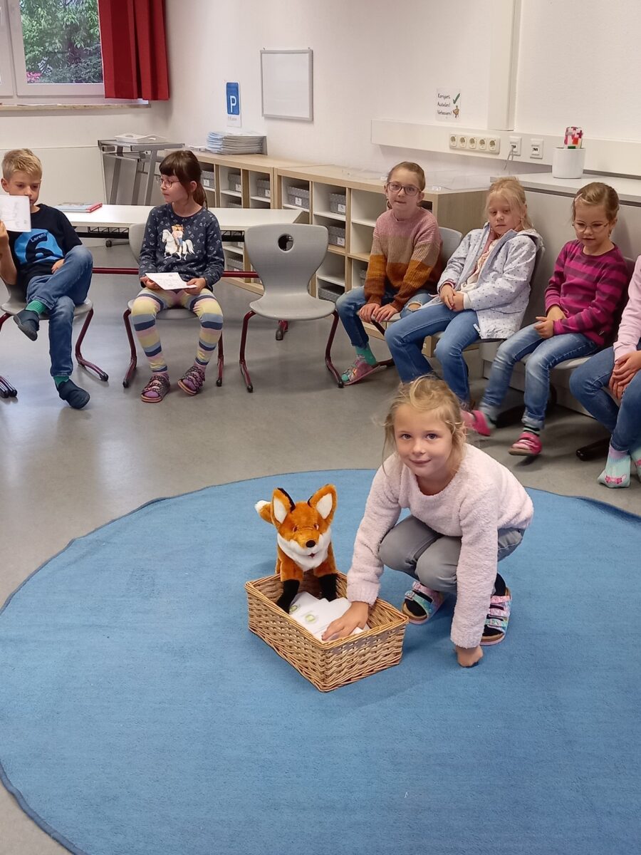 Selbstverständlich brachten die Erstklässler ihr Gäste in einer kleinen Erzählstunde schultechnisch auf den neuesten Stand. Bis zum nächsten Treffen mit dem Fuchs dürfen die Kinder in der Bücherkiste, welche Conny Greiner-Braun mitbrachte, schmökern.