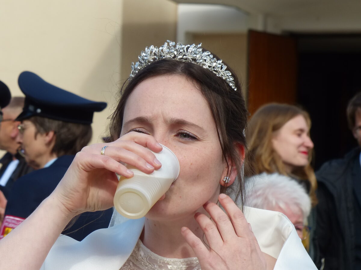 Das frisch vermählte Brautpaar musste unzählige Glückwünsche annehmen, was bei Sonnenschein und fast sommerlichen Temperaturen leicht fiel. Erst bei den letzten Gratulanten setzte ein leichter Regen ein.