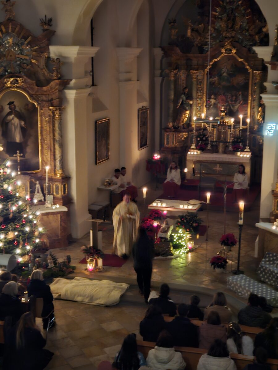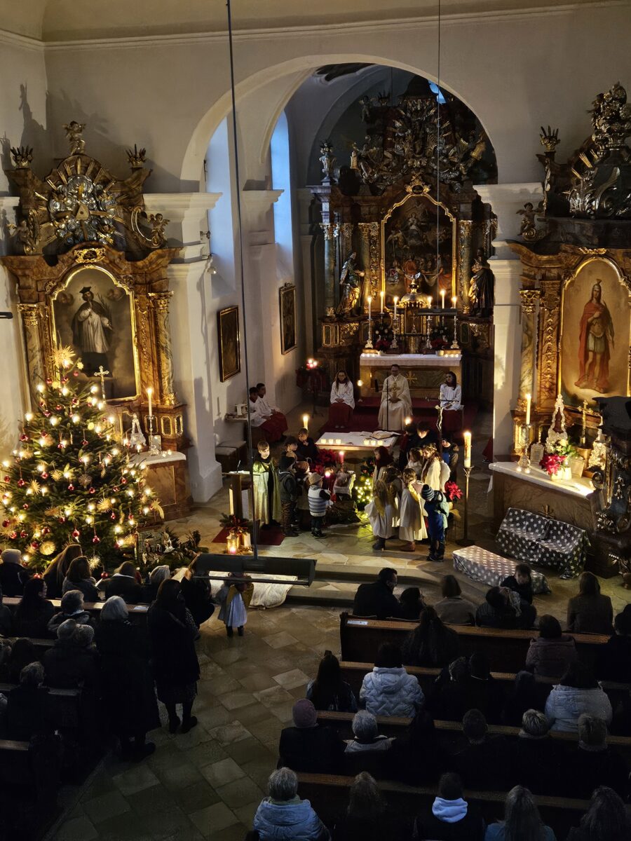 Endlich läutete die kleine Glocke an der Sakristei zum Beginn. Zum leisen Orgelspiel (Julia Fehr) sprachen Corinna Hösl und Gabriele Buchbinder die Gedanken und Erwartungen an dieses Fest an. Von zu erwartenden Geschenken, dem guten Essen, der gewünschten Stimmung, aber auch die Nichterfüllung aller Wünsche war ein Thema. Dass nicht alle Kranken gesund oder alle Waffen eingeschmolzen werden. Diese Nacht sei nicht die Erfüllung aller Wünsche. Aber sie gebe diesem Leben ein neues Gesicht. Dekan Alexander Hösl verstand es hervorragend, den Bogen vom heutigen Weihnachten, der Geburt Jesu, zum noch fernen Ostern – dem Tod und der Auferstehung – zu spannen.
