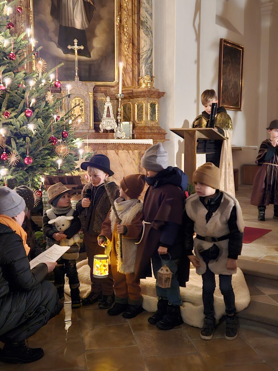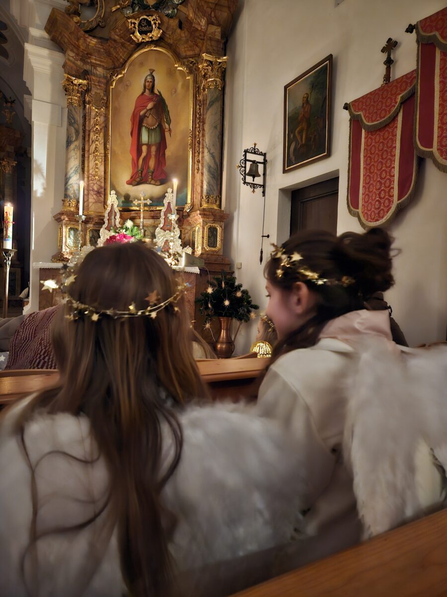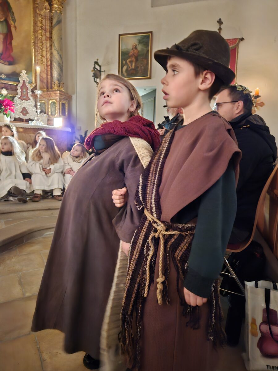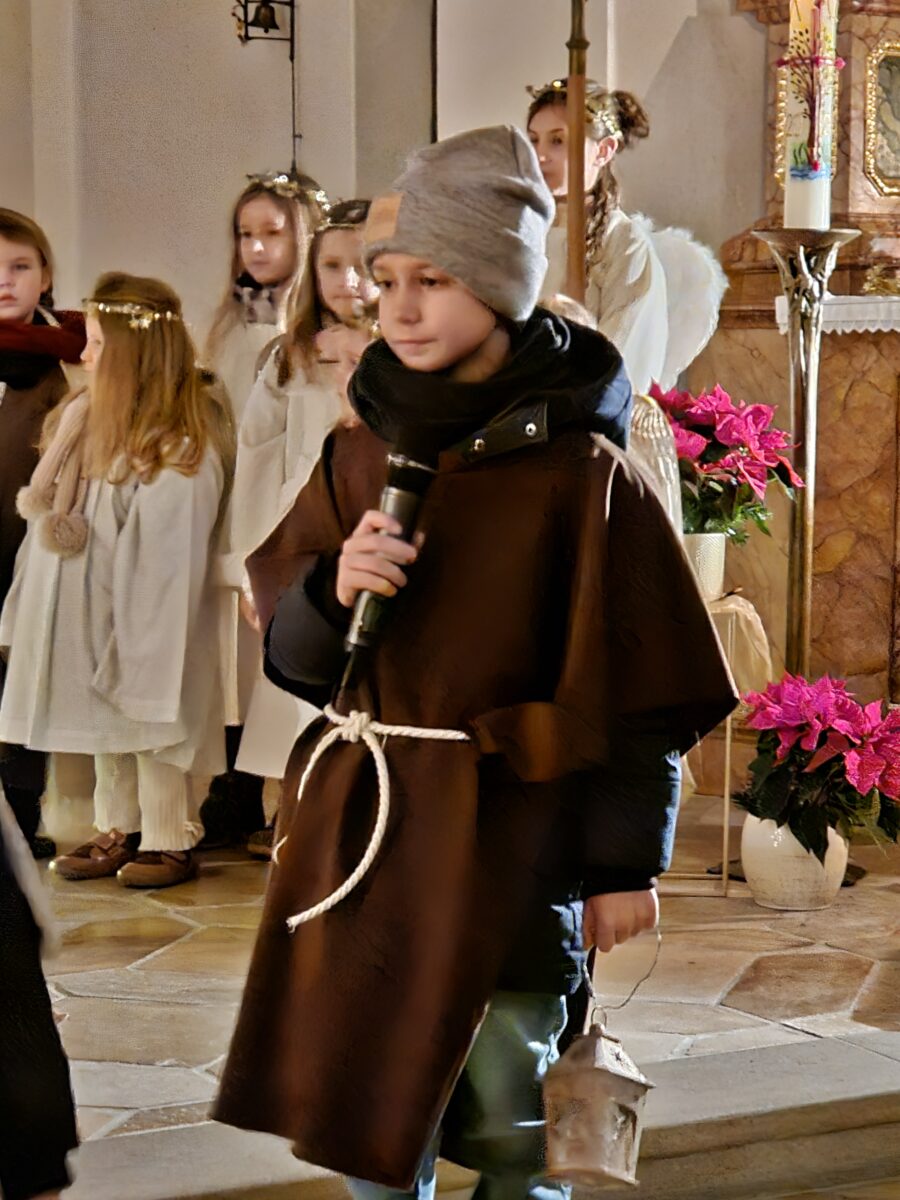 Dann war es soweit, die fast spürbare Spannung der Jungen und Mädchen, die an diesem Abend das Evangelium als Krippenspiel aufführen durften, löste sich. Erzähler Jonas Ogarek nahm die Kirchengemeinde mit auf die Reise vor über 2000 Jahren. Der Erzengel Gabriel (Mathilda Kiener) verkündete der anmutigen Maria (Luisa Hösl) die fantastische Botschaft, dass sie die Mutter des Erlösers Jesus Christus sein wird. Die wiederum überzeugte ihren Verlobten Josef (Jonas Wirth), dass er Vertrauen auf das Kommende haben solle. Auch wenn in der Generalprobe der Heiligenschein aus einem Sternenhaarreif noch kratzte oder die Hirten noch eher zögernd der Aufforderung des Oberhirten Lukas Bock (der eine Doppelrolle spielte, da sein Bruder Simon leider krank war) folgten, so innig und berührend spielten die Kinder an diesem Abend ihre biblische Rolle.