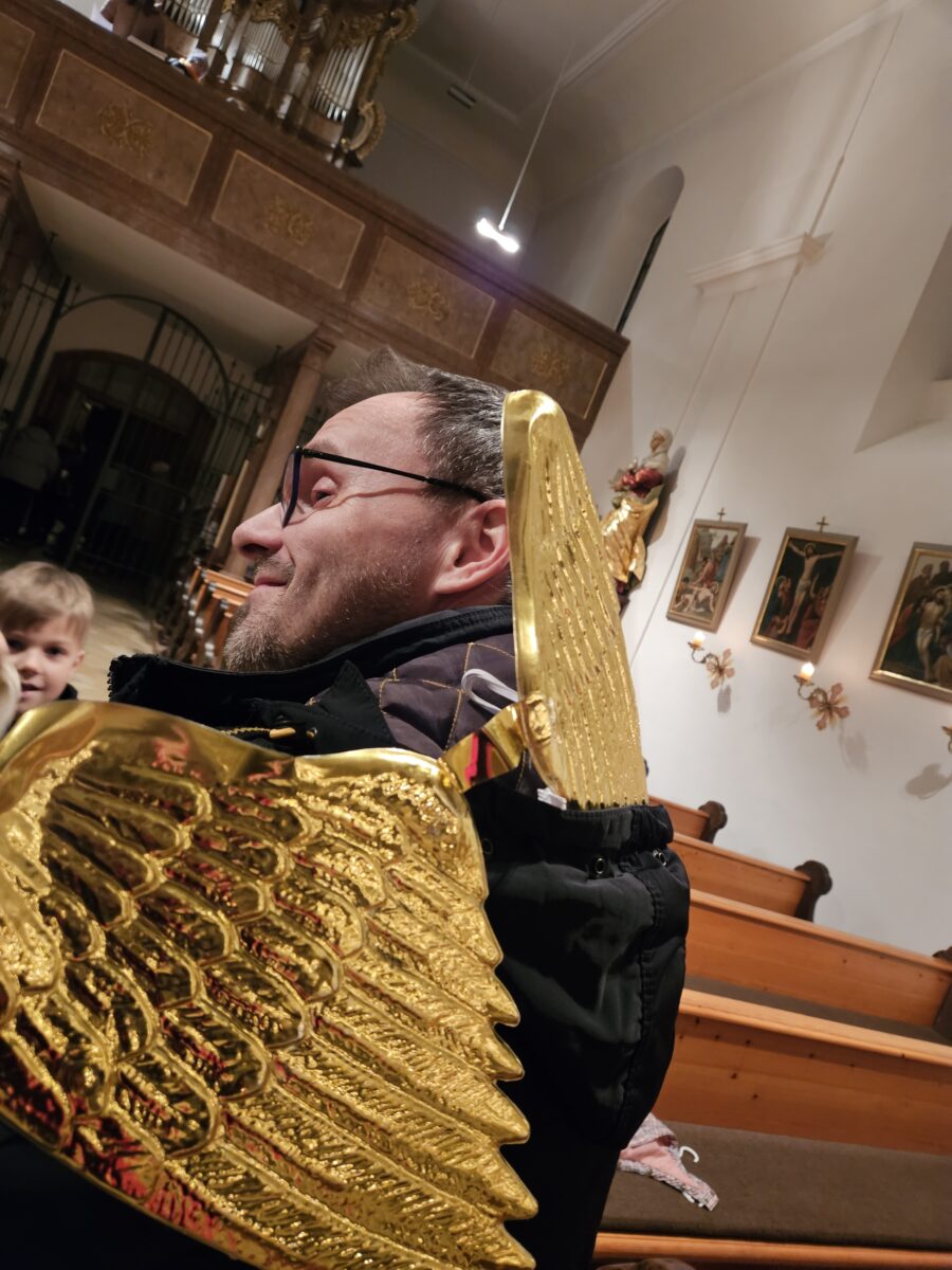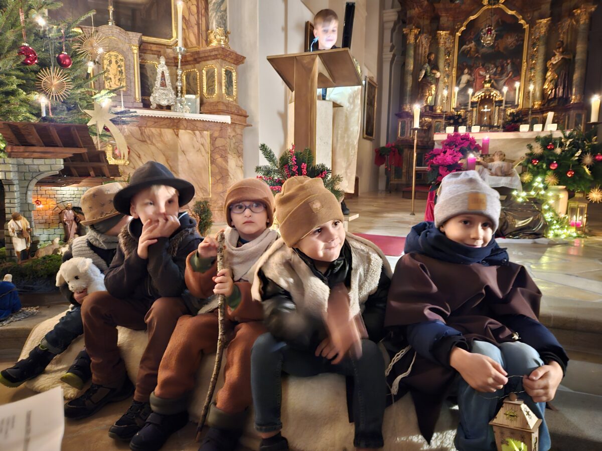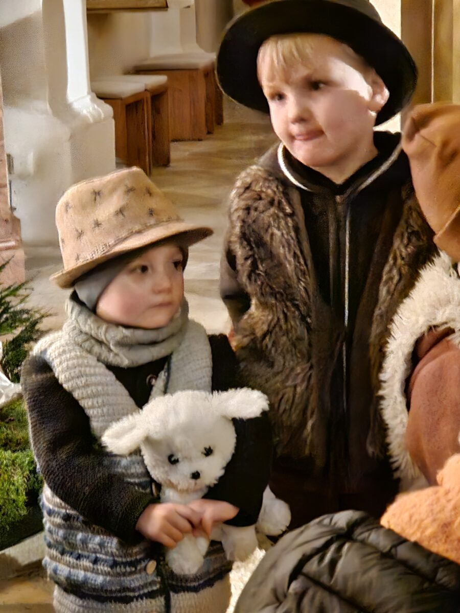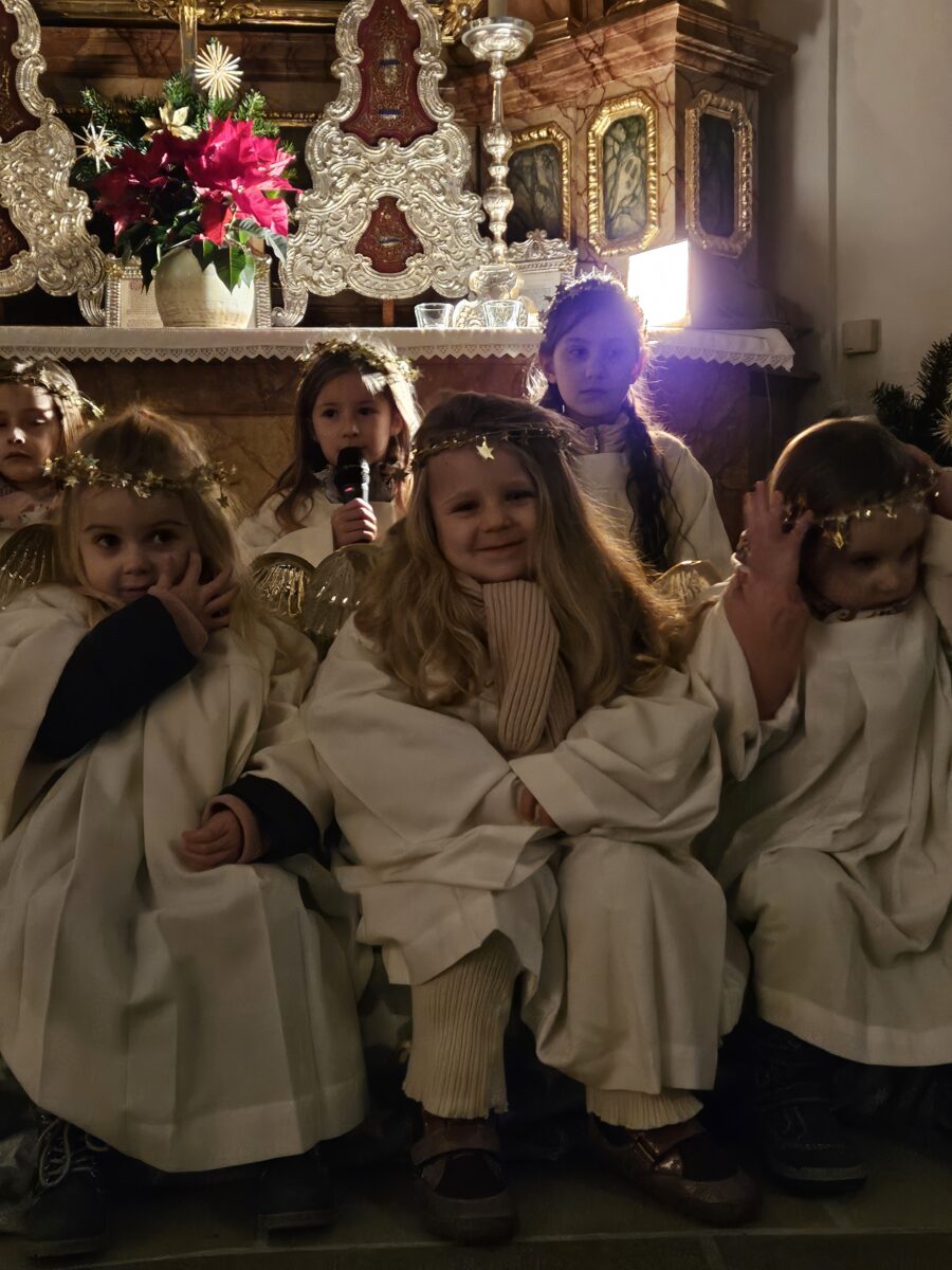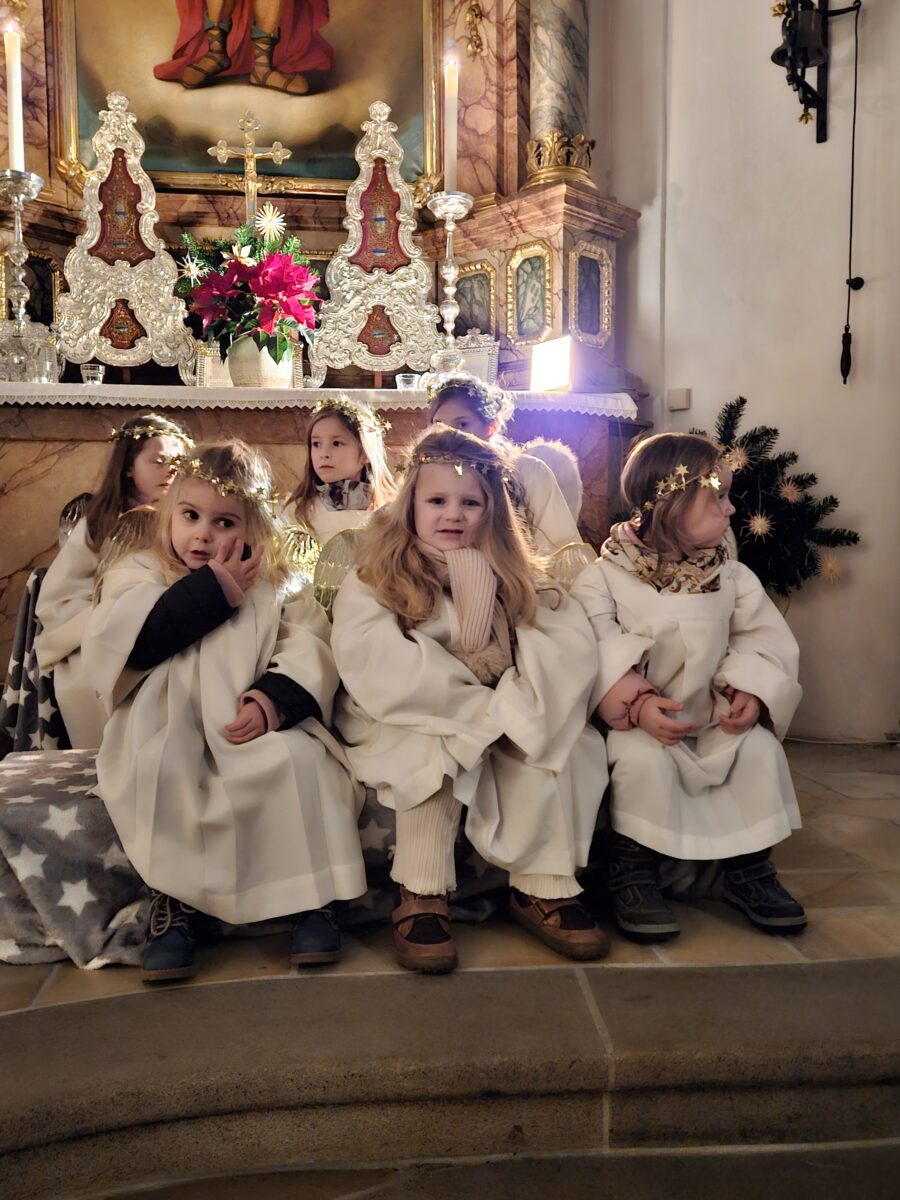 Dann war es soweit, die fast spürbare Spannung der Jungen und Mädchen, die an diesem Abend das Evangelium als Krippenspiel aufführen durften, löste sich. Erzähler Jonas Ogarek nahm die Kirchengemeinde mit auf die Reise vor über 2000 Jahren. Der Erzengel Gabriel (Mathilda Kiener) verkündete der anmutigen Maria (Luisa Hösl) die fantastische Botschaft, dass sie die Mutter des Erlösers Jesus Christus sein wird. Die wiederum überzeugte ihren Verlobten Josef (Jonas Wirth), dass er Vertrauen auf das Kommende haben solle. Auch wenn in der Generalprobe der Heiligenschein aus einem Sternenhaarreif noch kratzte oder die Hirten noch eher zögernd der Aufforderung des Oberhirten Lukas Bock (der eine Doppelrolle spielte, da sein Bruder Simon leider krank war) folgten, so innig und berührend spielten die Kinder an diesem Abend ihre biblische Rolle.