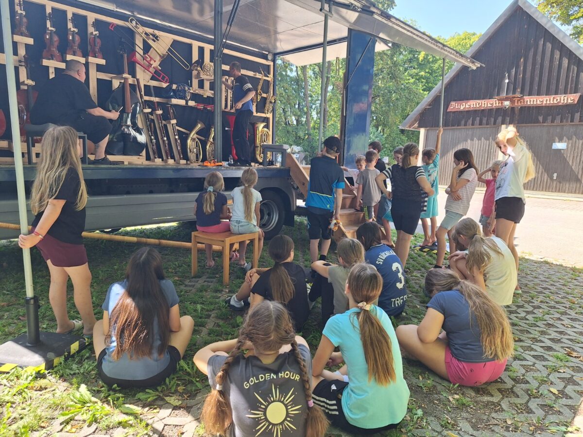 Musikalisch war auch einiges geboten: in rhythmischen Einheiten mit Boomwhackers und Cupsongs zu modernen Popsongs wurden alle mit Spaß an die Freude des Musizierens herangeführt. Als besonderes Highlight war der mobile Kulturkiosk von Abenteuer Kultur vor Ort, bei dem die Teilnehmer im sogenannten Instrumentenkarussell zahlreiche Instrumente kennenlernen und ausprobieren konnten.