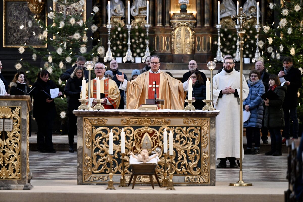 Der Caritasvorsitzende Michael Dreßel und Caritasdirektor Michael Weißmann zelebrieren die Christmette. Ihre Botschaft: “Das Volk, das im Dunkel lebt, sieht ein helles Licht”. Diese Worte leiten die Messe ein und verweisen auf das zentrale Thema des Abends – Hoffnung und Zusammenhalt. Die Feierlichkeiten setzten ein starkes Zeichen der Gemeinschaft. “Sie sind nicht vergessen. Gott sieht Sie. Und er liebt Sie”, so die Botschaft an die Gäste.