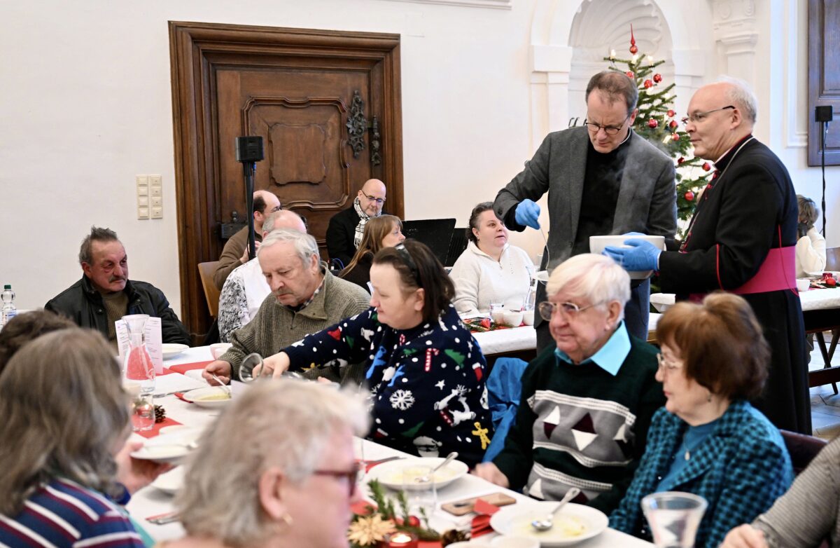 Nach der Messe lädt die Caritas zum gemeinsamen Essen ein. Bischof Rudolf, Fürstin Gloria und Fürst Albert von Thurn und Taxis begleiten die Veranstaltung. Sie servieren Brokkoli-Suppe, Jägerbraten mit Knödel und Blaukraut sowie als Nachspeise eine Auswahl an Gebäck und Punsch. Die musikalische Gestaltung übernehmen Andreas Meixner mit einem speziell formierten “Weihnachtschor” und Matthias Leitner am E-Piano.