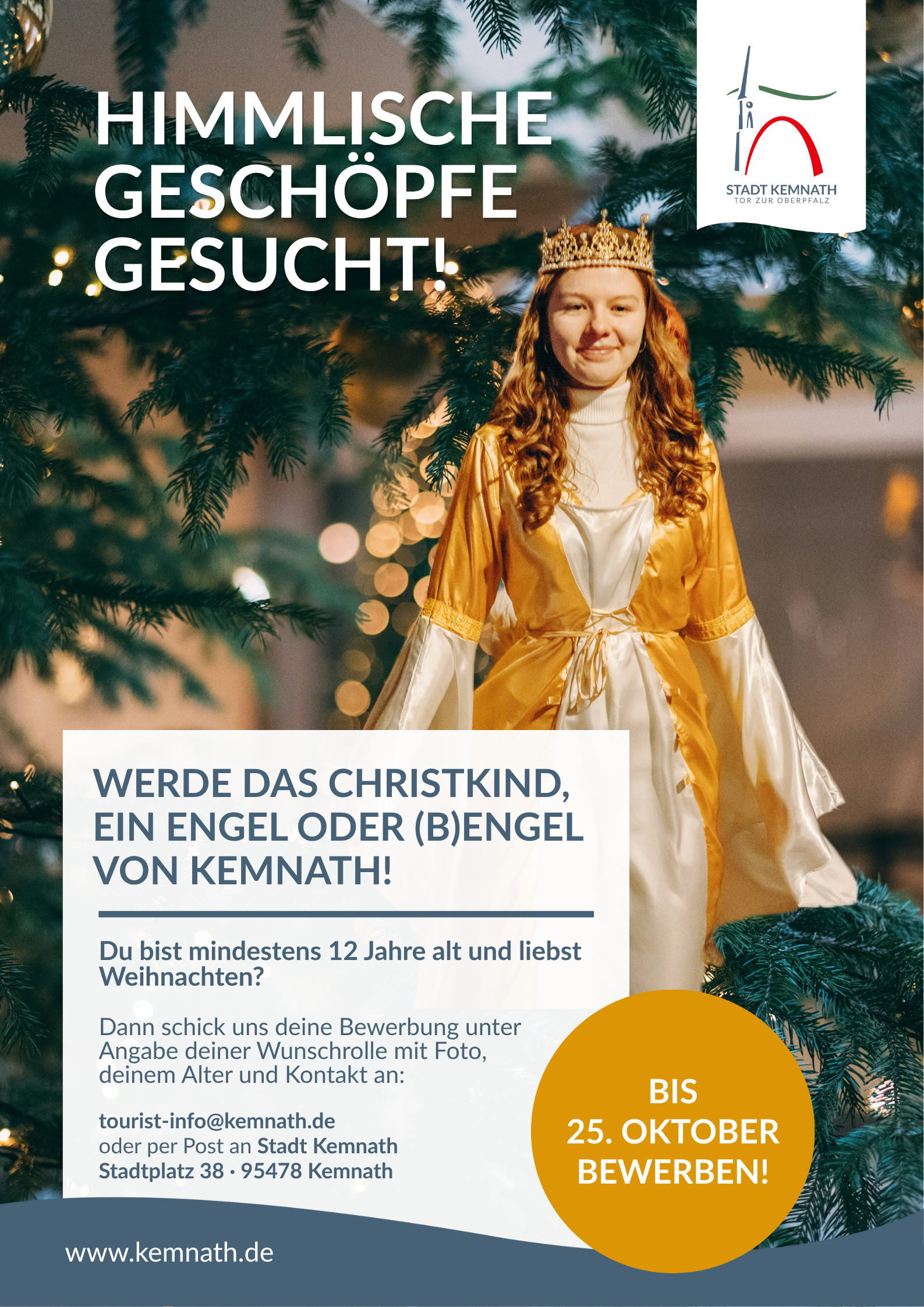 Die Stadt Kemnath lädt alle interessierten Jugendlichen ab zwölf Jahren ein, sich als Christkind, Engel oder (B)engel zu bewerben. Neben Freude an der Weihnachtszeit sollte auch die Bereitschaft mitgebracht werden, Menschen mit Herzlichkeit und Ausstrahlung ein Lächeln ins Gesicht zu zaubern.