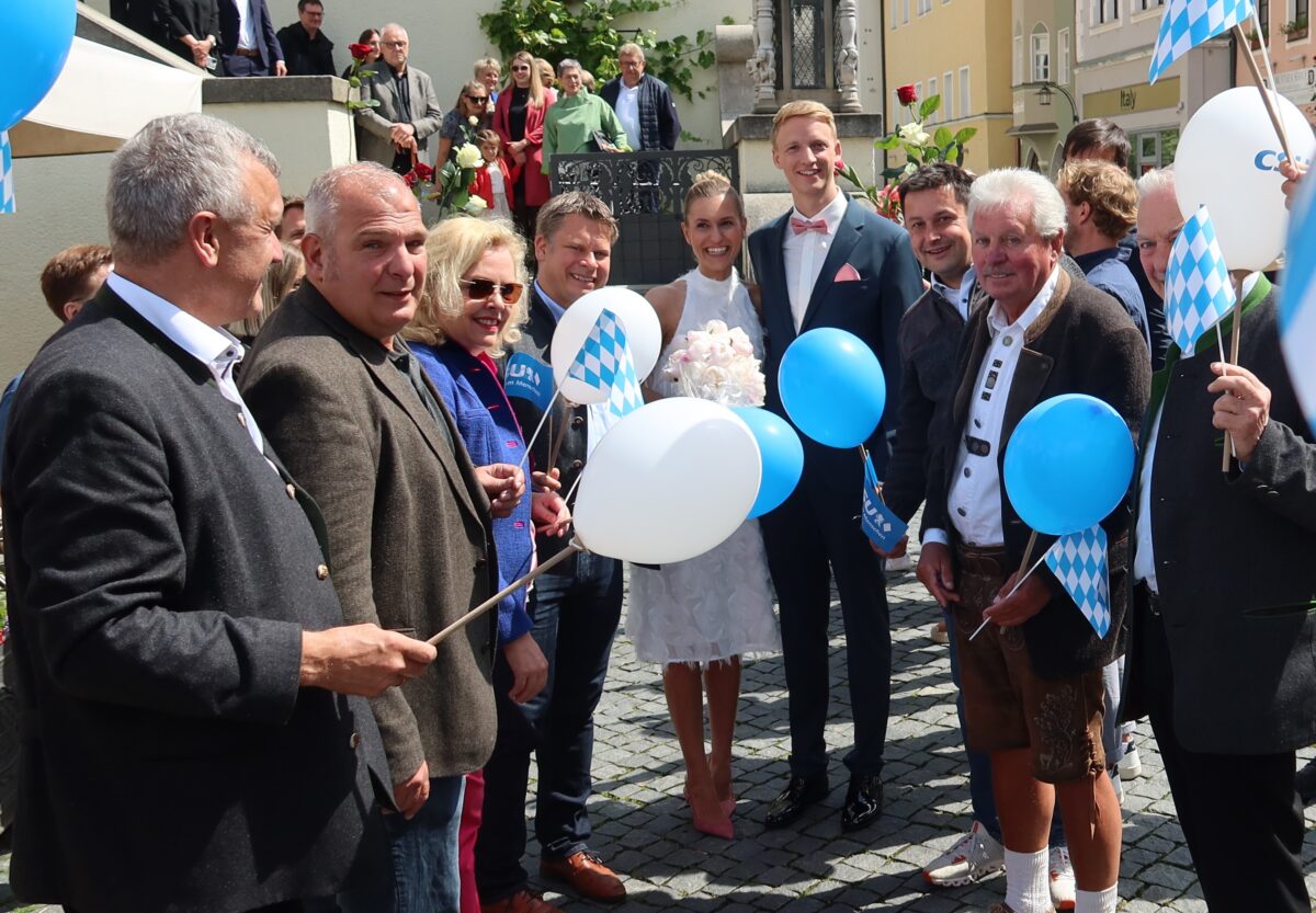 Luftballons, Fähnchen, Knochen, Akkuschrauber und eine Schere. Großer Bahnhof für das Hochzeitspaar. Das Spalier vor dem Alten Rathaus war mehr als 20 Meter lang. Verwandte, Parteifreunde und Kollegen gratulierten am Samstagvormittag dem Brautpaar Sophia Schütz und Christoph Schirdewahn zur standesamtlichen Hochzeit.