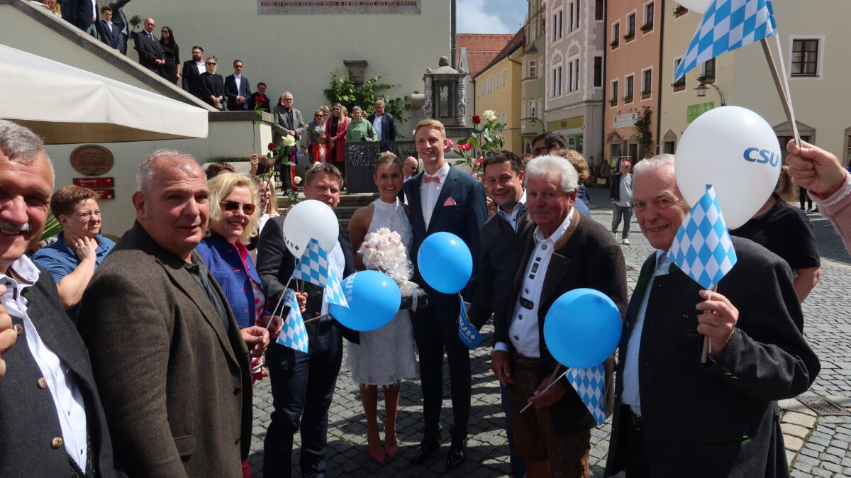 Dort hatte es sofort gefunkt. Der Bräutigam ist Schatzmeister bei der CSU Weiden-Ost. Deshalb war die komplette Vorstandschaft der Christsozialen anwesend. Vorher musste sich das Paar durch Mullbinden schneiden.