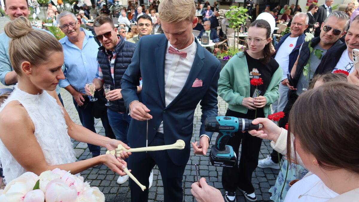 Zuletzt gelang dem Arzt dann vor Kollegen noch ein chirurgischer Eingriff an zwei Plastikknochen, die er zusammenschraubte, ehe das Paar mit Freunden auf seinen großen Tag anstoßen durften.