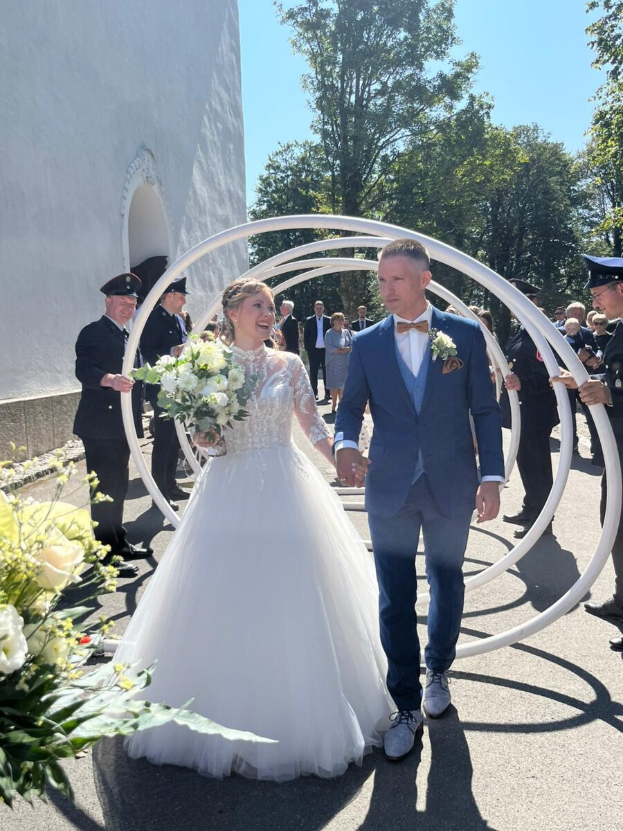 Im Februar 2019 haben sie sich zufällig am frühen Morgen im Nexans-Büro getroffen und sind dabei ins Gespräch gekommen. „Auch scho auf?!”, meinte Matthias damals zu seiner Kollegin Daniela. Diese kurzen Worte waren der Anfang ihrer Liebe, die am vergangenen Samstag mit dem Ja-Wort in der Wallfahrtskirche Mariä Heimsuchung den Höhepunkt hatte. Bei dieser Abgabe einer „Reisekostenabrechnung“ wurde aus dem offiziellen Teil eine Liebe fürs Leben. Dann ging es Schlag auf Schlag, die beiden Wirtschaftsingenieure haben im Januar 2020 standesamtlich im alten Rathaus in Weiden geheiratet, sie haben mittlerweile zwei Buben, den vierjährigen Elias und den einjährigen Clemens. Da ihnen „Corona“ einen Strich durch die Rechnung gemacht hatte, mussten sie die kirchliche Trauung auf den 24. August 2024 verschieben.