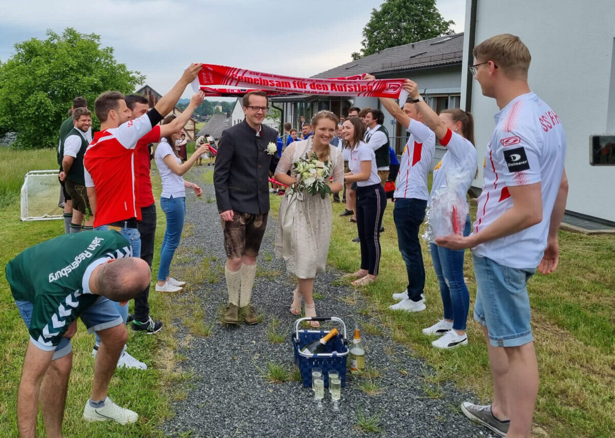 Freunde aus Anzing waren aus der Landeshauptstadt angereist, um dem Paar zu gratulieren und brachten exklusiv ein Wappen für das Rathaus und dem Waldthurner Bürgermeister mit. Auch die Jahnfreunde Vohenstrauß, bei denen das Paar bei den Spielen des SSV Jahn Regensburg mitfiebert, waren so wie die Fußballerinnen und Fußballer des SV Altenstadt/Vohenstrauß gekommen, um die Glückwünsche zu überbringen.