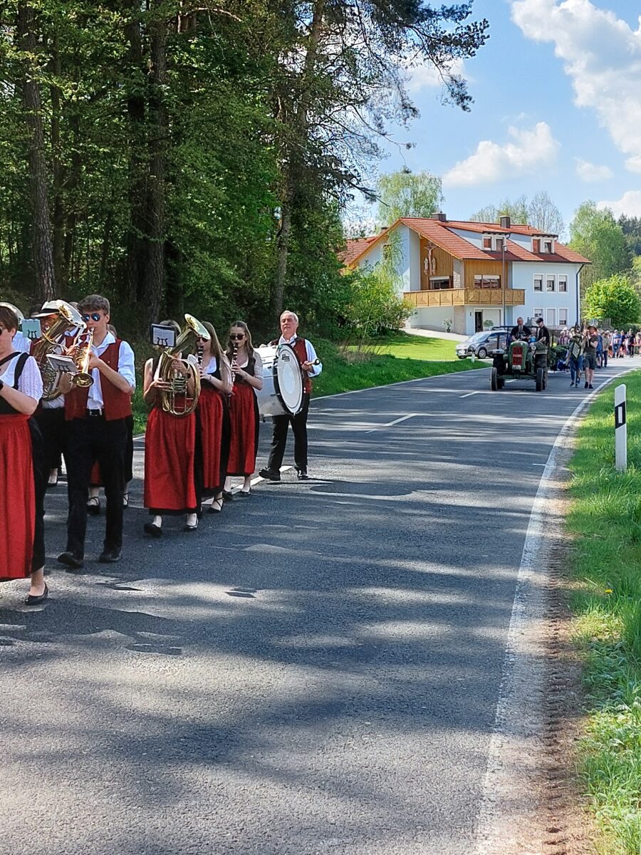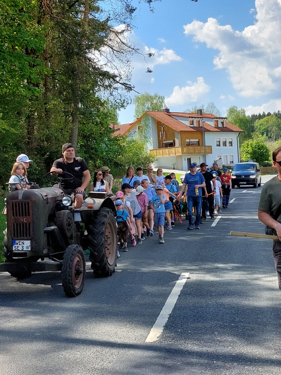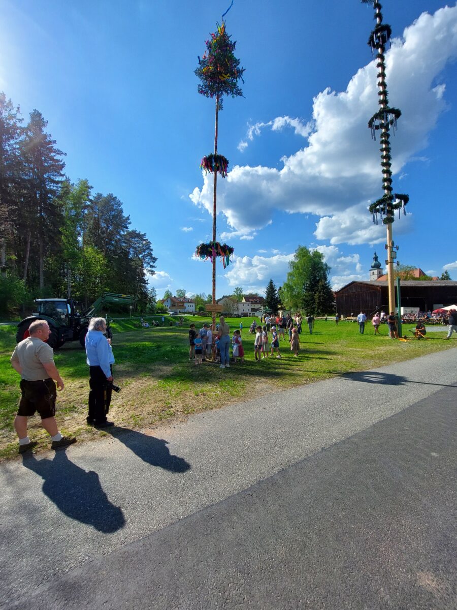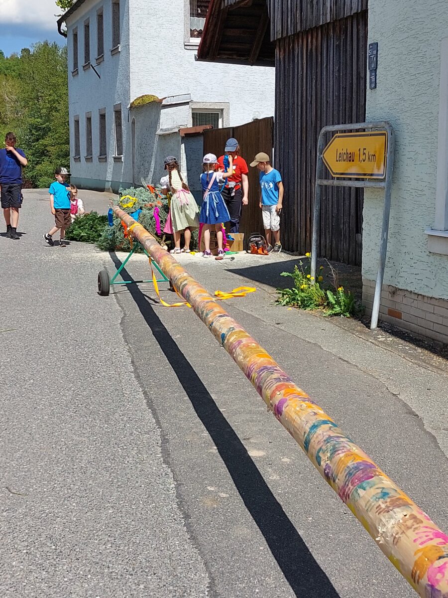 Nach einer wohlverdienten Stärkung geht es weiter. Mit umweltverträglichen Farben wird der auserwählte Maibaum bunt bemalt. Nach einer weiteren kurzen Pause wird er geschmückt und in einem Festzug, zusammen mit dem großen Maibaum der Erwachsenen auf die Dorfwiese gebracht. Erst wird der Maibaum der Erwachsenen aufgestellt. Danach kommt auch für den Kindermaibaum, der heuer auch schon über 20 Meter lang ist, die ,,Stunde der Wahrheit” und er wird unter großem ,,Hauruck”, natürlich unter Hilfe der Erwachsenen, aufgestellt.