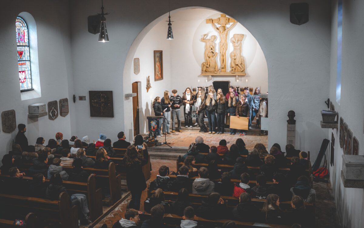 Die Schüler*innen aus Hof setzten sich mit Biografien von Flossenbürg-Gefangenen unterschiedlicher Häftlingskategorien auseinander, um die Vielfalt der Opfergruppen und den Verfolgungseifer der Täter sichtbar zu machen. Sie trugen außerdem Dietrich Bonhoeffers Gedicht „Von guten Mächten treu und still umgeben“ vor, das dieser im Dezember 1944 in Gestapo-Haft schrieb.