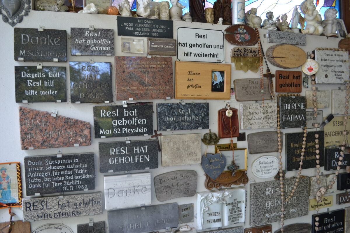 Seit Jahrzehnten ist das Grab der Resl auf dem Konnersreuther Friedhof eine Pilgerstätte. Auf Hunderten Votivtafeln, Bildern und Schildern danken Menschen aus aller Herren Länder der Therese Neumann für ihre Hilfe: “Durch Fürsprache in einem schweren seelischen Anliegen für meine Nichte Jutta der lieben Resl herzlichen Dank für ihre Fürbitte”, “Vergelt’s Gott Resl für Hilfe im Darmleiden. München 1984”, “Liebe Resl, vergelt’s Gott! Du hast mich bei einem schweren Verkehrsunfall als Beifahrer am 3. Oktober 2005 am Unfallort wieder ins Leben zurückgeholt, nach langem Koma wieder aufgeweckt, mir meine Sprache wiedergegeben und mir geholfen, vom Rollstuhl wegzukommen.” So und ähnlich lauten die Danksagungen – viele auch aus Holland: “Bedankt voor de Genezing in 1988” heißt es auf einem Schild. Mit Beginn des Seligsprechnungsprozesses mussten alle Danksagungen vom Grab entfernt werden. Seither hängen sie in einer eigens gebauten Votivkapelle.