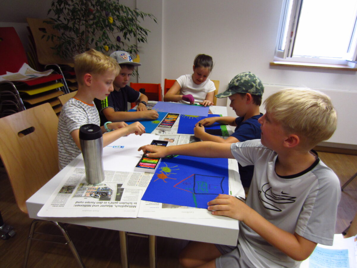 Zuerst lernten die Kinder das Buch “Streik der Farben” von Drew Daywalt kennen. Die Geschichte handelt von Duncan, der in seiner Box keine Malstifte mehr findet. Die Stifte sind in den Streik getreten, weil sie mit den Arbeitsbedingungen unzufrieden sind. In Zweiergruppen suchten die Kinder bei einer Schnitzeljagd die Beschwerdebriefe der Farben.