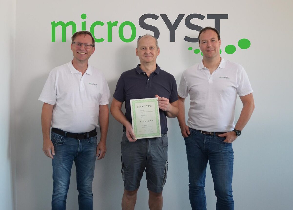 Nachdem bereits im Januar und Mai sechs langjährige Mitarbeiter mit zusammen 135 Jahren Betriebstreue geehrt wurden, kommen jetzt nochmals 20 Jahre – oder 7.300 Tage – hinzu: Michael Schmiegler und Albert Süß stehen seit jeweils zehn Jahren täglich ihren Mann bei Microsyst.