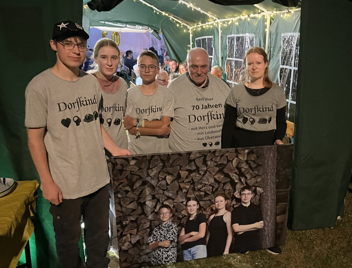 Die Krönung setzten der Feier die Enkel Kornelius, Lyn, Korbinian und Vivian auf. Sie hatten für ihren Opa allerlei gute Ratschläge und Utensilien bereit und betonten mit T-Shirts und großem Bild, wie lebenswert es ist, ein Dorfkind zu sein.