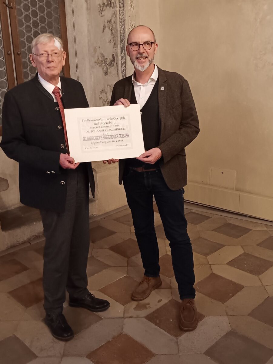 „In unzähligen Vorträgen, Tagungen und Exkursionen teilte Dr. Laschinger sein Wissen und seine Expertise“, so Dr. Feuerer. Unter anderem veröffentlichte das neue Ehrenmitglied über 130 Publikationen, darunter das dreibändige Standardwerk über die Rechtsquellen der Stadt Amberg sowie eine Monografie über die ehemalige Hauptstadt der Oberpfalz. Zahlreiche Aufsätze Laschingers sind auch in den renommierten Verhandlungen des Historischen Vereins für Oberpfalz und Regensburg erschienen.