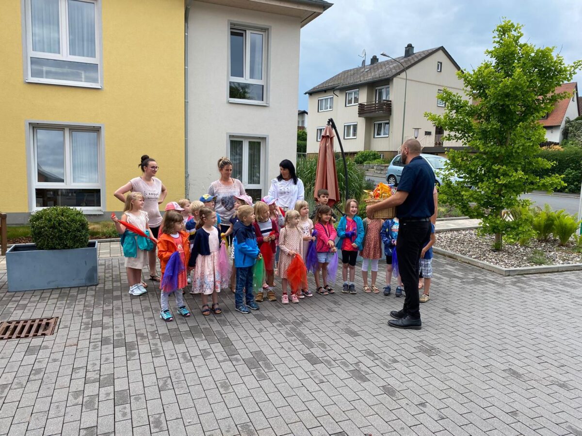 In Neusorg gab es hierzu im Senioren-Servicehaus ein großes Sommerfest, tagsüber für alle Bewohnerinnen und Bewohner und abends für alle Mitarbeiterinnen und Mitarbeiter des Hauses. Eröffnet hat die Feier das Kinderhaus Neusorg, das ein Fingerspiel im Dialekt vorführte. Kinderhausleitung Daniele Burger überreichte zum Jubiläum einen Blumenstrauß mit einer gebastelten Karte, die für alle Bewohner in der Einrichtung gut platziert wurde.