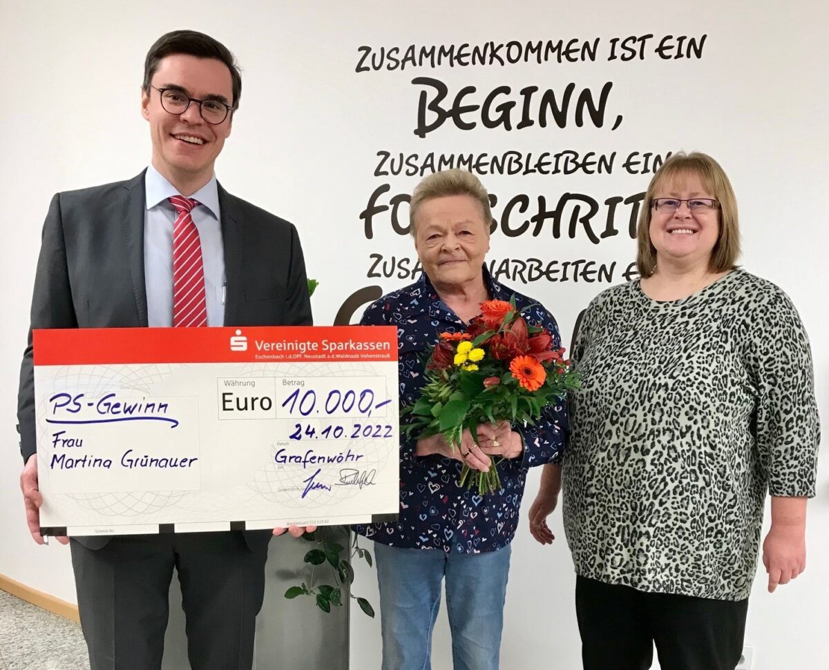 Eine besondere Überraschung hatten Martina Buchfelder und Michael Schelkshorn von der Sparkassen-Geschäftsstelle in Grafenwöhr für Martina Grünauer aus Schwarzenbach. Martina Grünauer beteiligt sich seit vielen Jahren am PS-Sparen der Vereinigte Sparkassen und jetzt belohnte man sie dafür. Bei der PS-Auslosung im September 2022 hat sie 10.000 Euro gewonnen. Die Rentnerin kann das Geld gut gebrauchen, da neue Außenanlagen geplant sind. Sie ist nicht die einzige Gewinnerin.