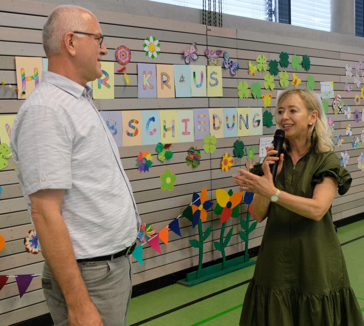 Die Abschiedsfeier wurde von den Auftritten der Schülerinnen und Schüler lebhaft gestaltet, die ihre Freude und ihren Dank in Liedern und Gedichten zum Ausdruck brachten. Besonders berührend war das gemeinsam gesungene „Gummibärenlied“ zu Beginn der Aufführungen, aber auch Klassenbeiträge wie „Du bist allererste Sahne“ und das „Bayerische Musikstück“ zogen die Anwesenden in ihren Bann. Der Lehrerchor, unter der Leitung von Silke Kitta, rührte mit Stücken wie „Heute feiern wir“ und „Mein Vater war ein Wandersmann – mit viel Glück wie die Sterne, die Erde und das Meer.“