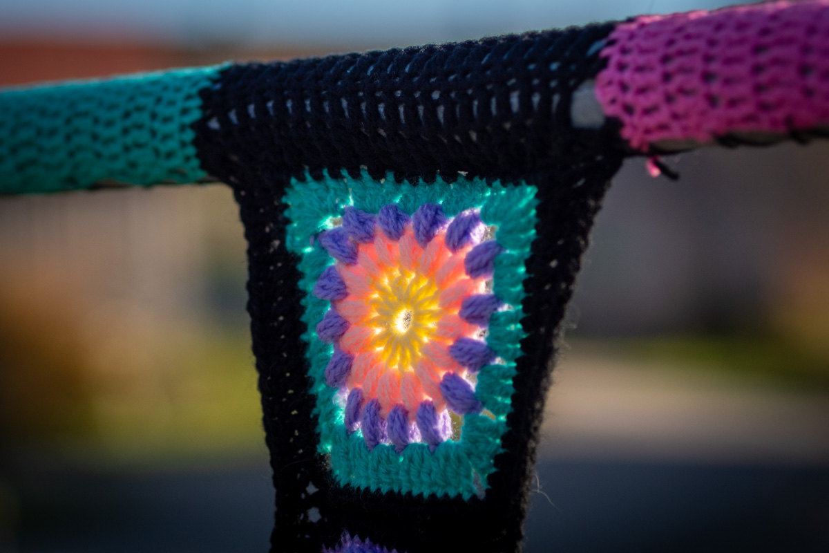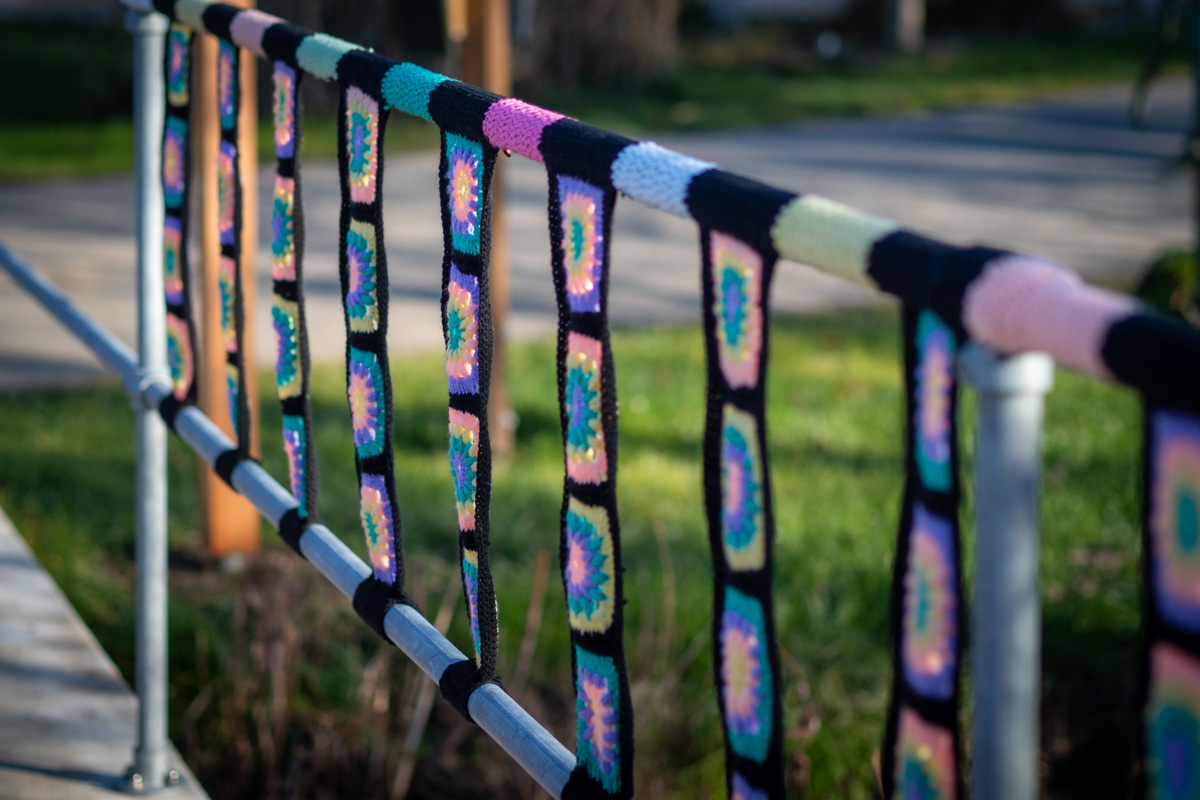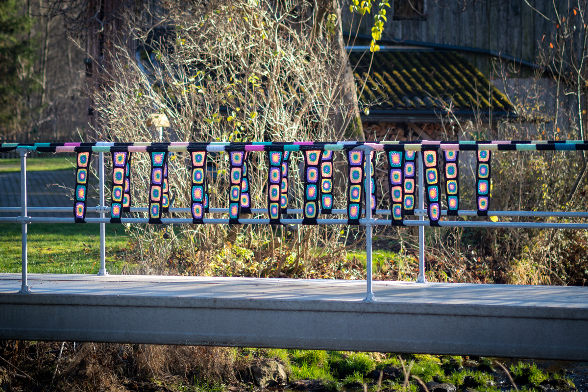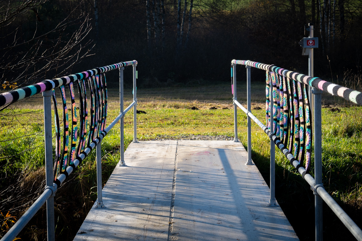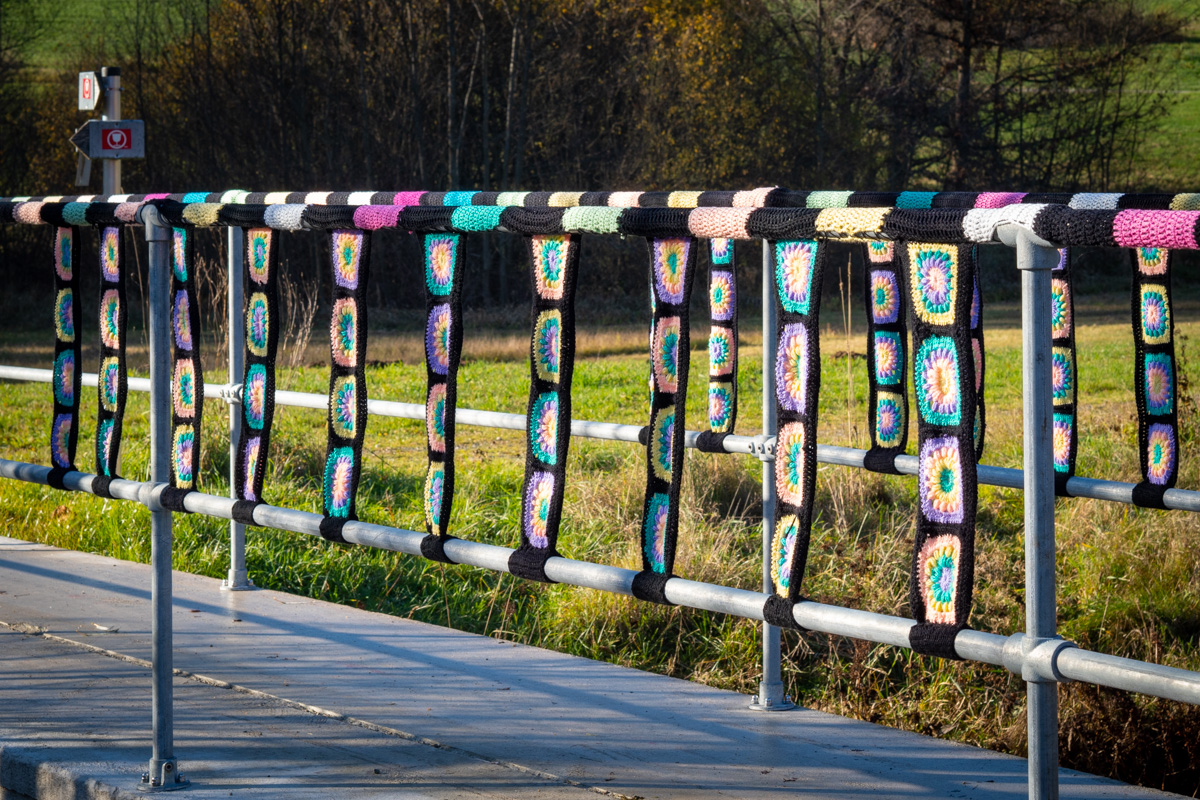 Das Brückengeländer ist nicht schön. In Städten hab ich schon oft gesehen, dass zum Beispiel Laternen umhäkelt geworden sind. Dann dachte ich mir: Ich mache das mit dem Brückengeländer auch.