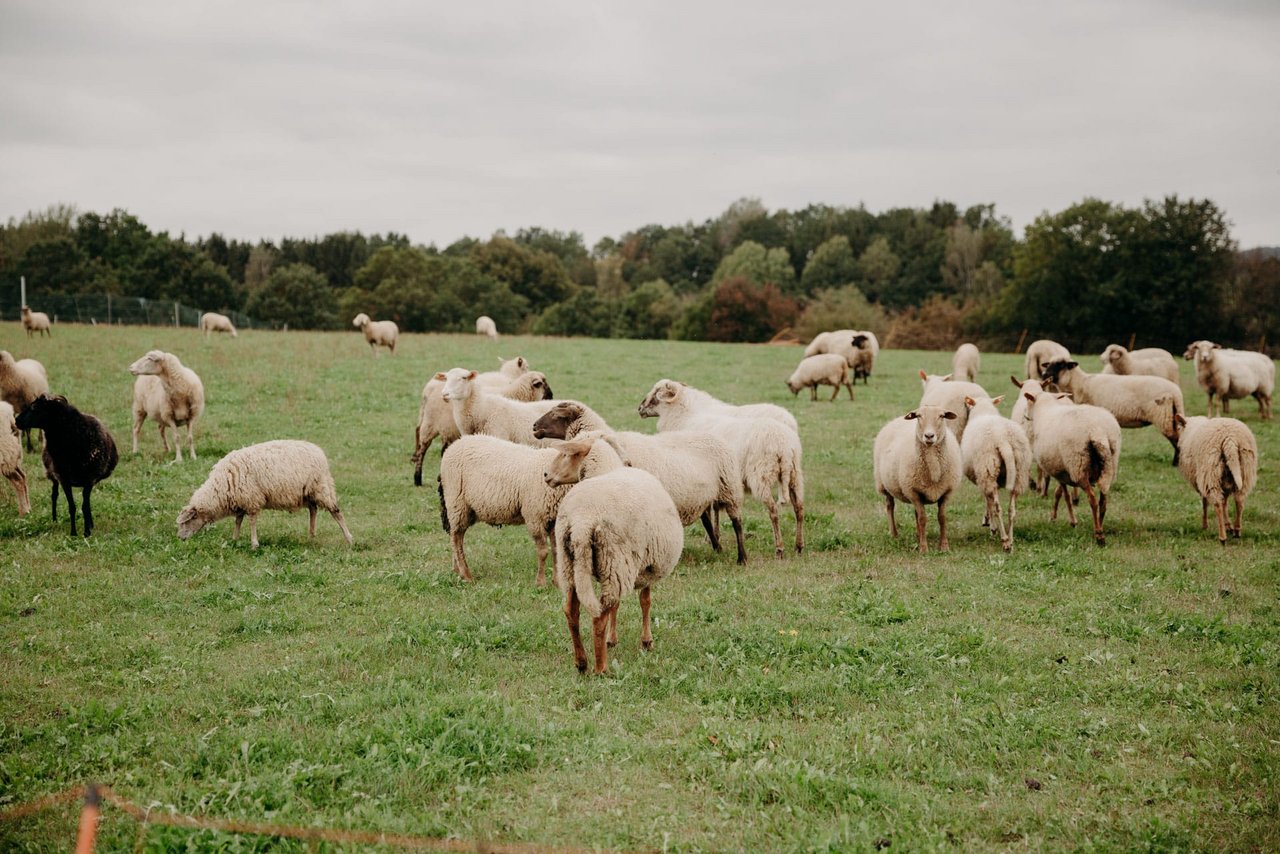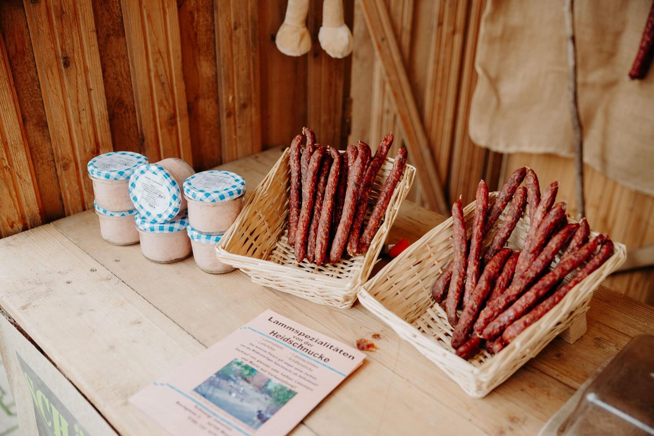 Anfangs bestand die Herde überwiegend aus der Rasse Heidschnucken. Heute ist die Herde eher ein internationales Mischvolk. „Um mehr Fleisch für unsere Wurstprodukte zu gewinnen, haben wir die eher zierlichen Heidschnucken mit anderen Rassen wie dem Coburger Fuchsschaf, dem Texelschaf oder dem Schwarzkopfbockschaf gekreuzt“, lässt uns der Züchter wissen.