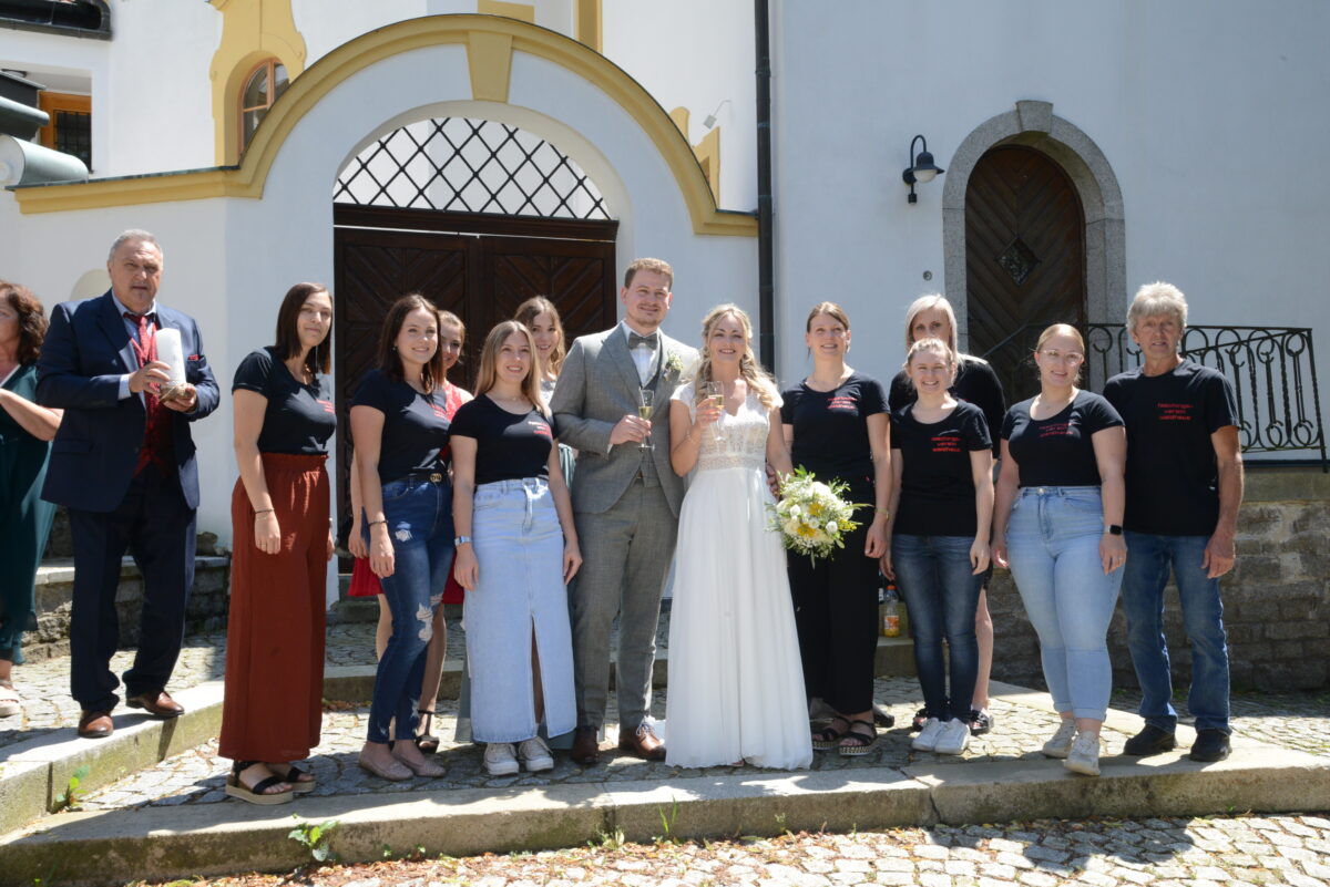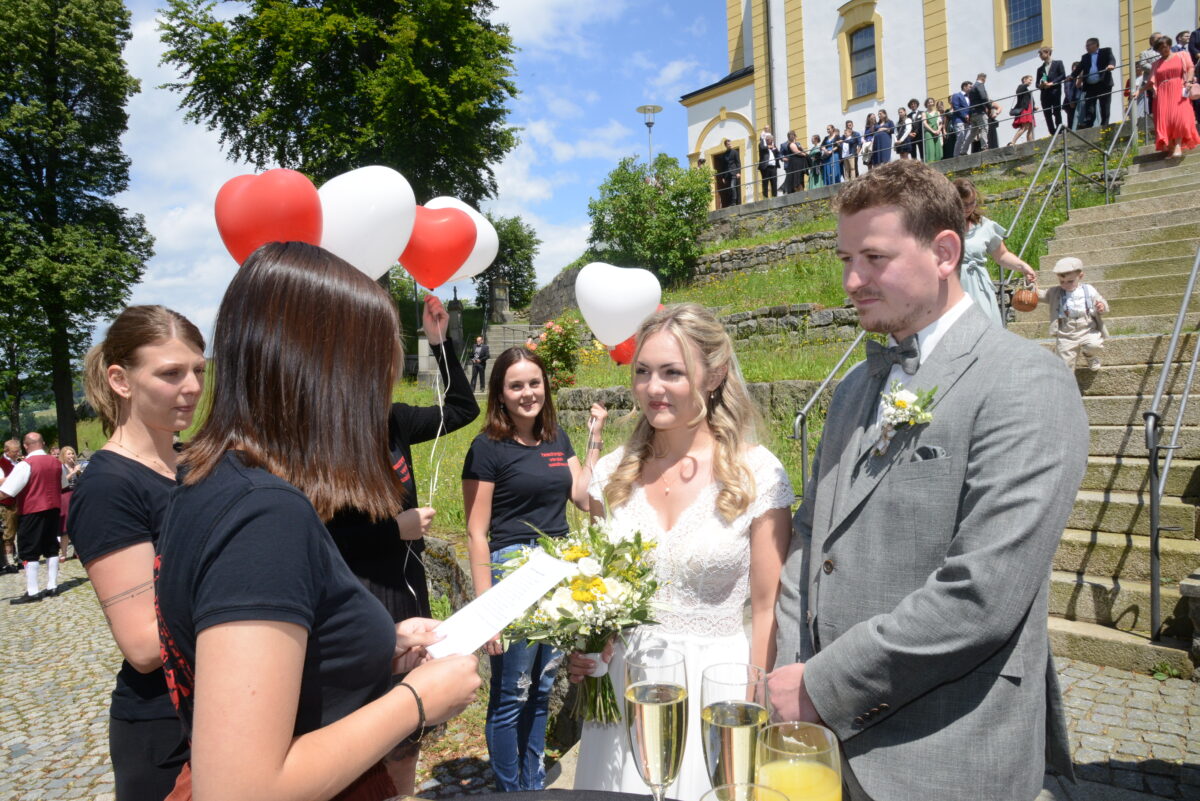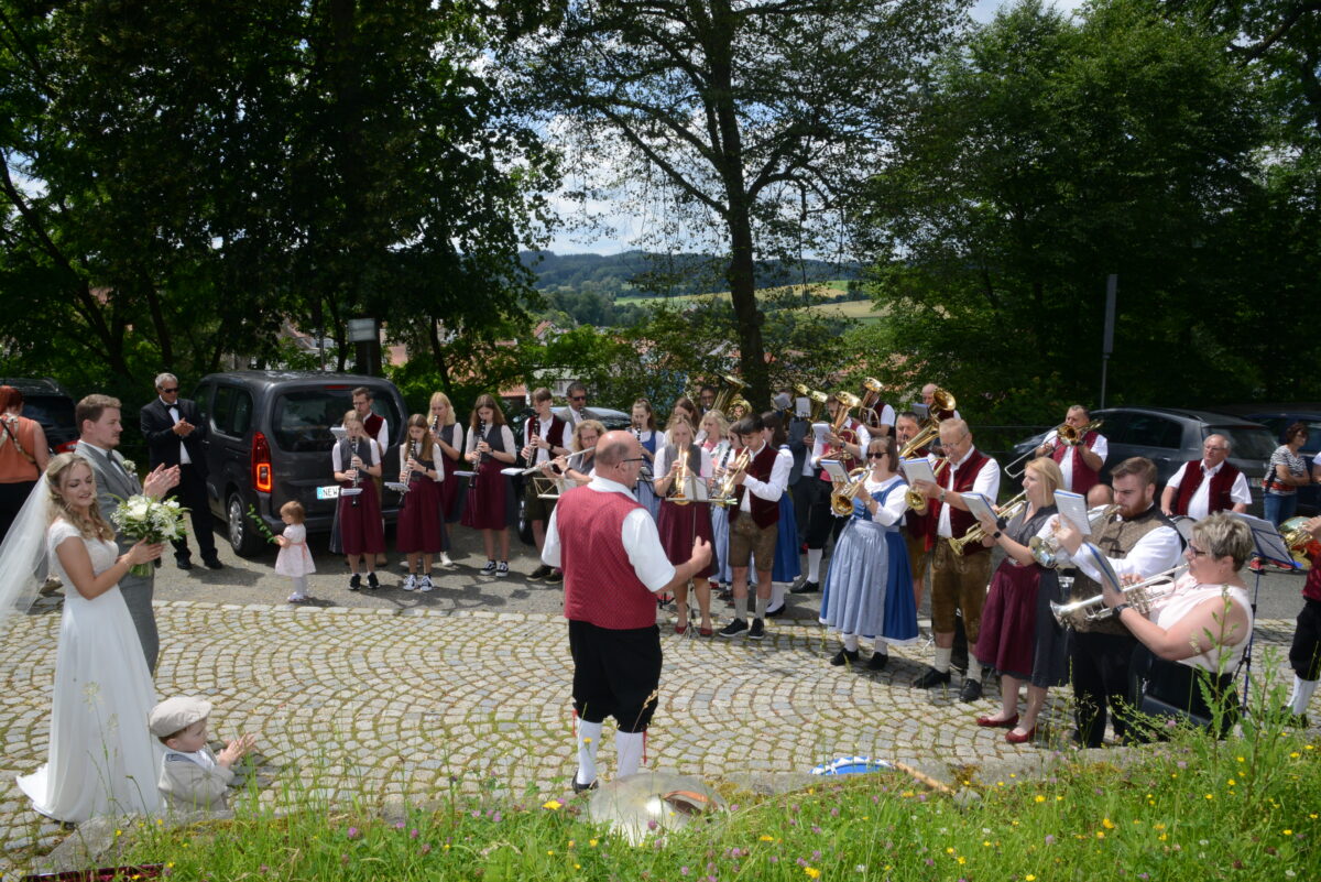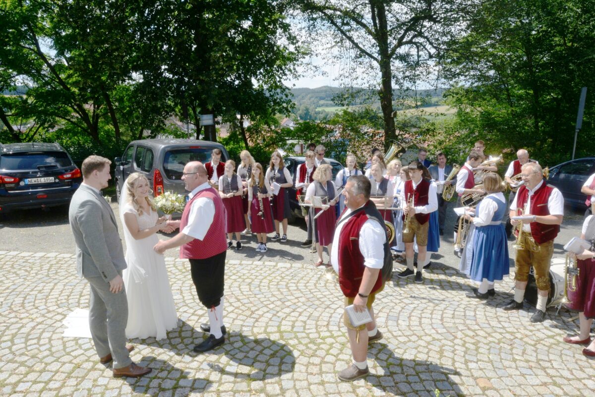 Nach dem Festgottesdienst wünschte eine Abordnung des Waidhauser Faschingsvereins dem Brautpaar in Gedichtform eine glückliche gemeinsame Zeit. Die Stadtkapelle Pleystein und der Musikverein Waidhaus hatten sich zu einem gemeinsamen Klangkörper zusammengeschlossen und spielten dem Brautpaar ein Ständchen.