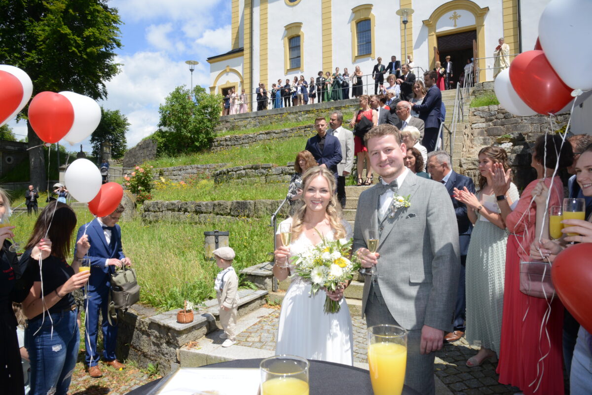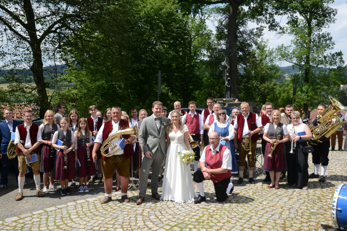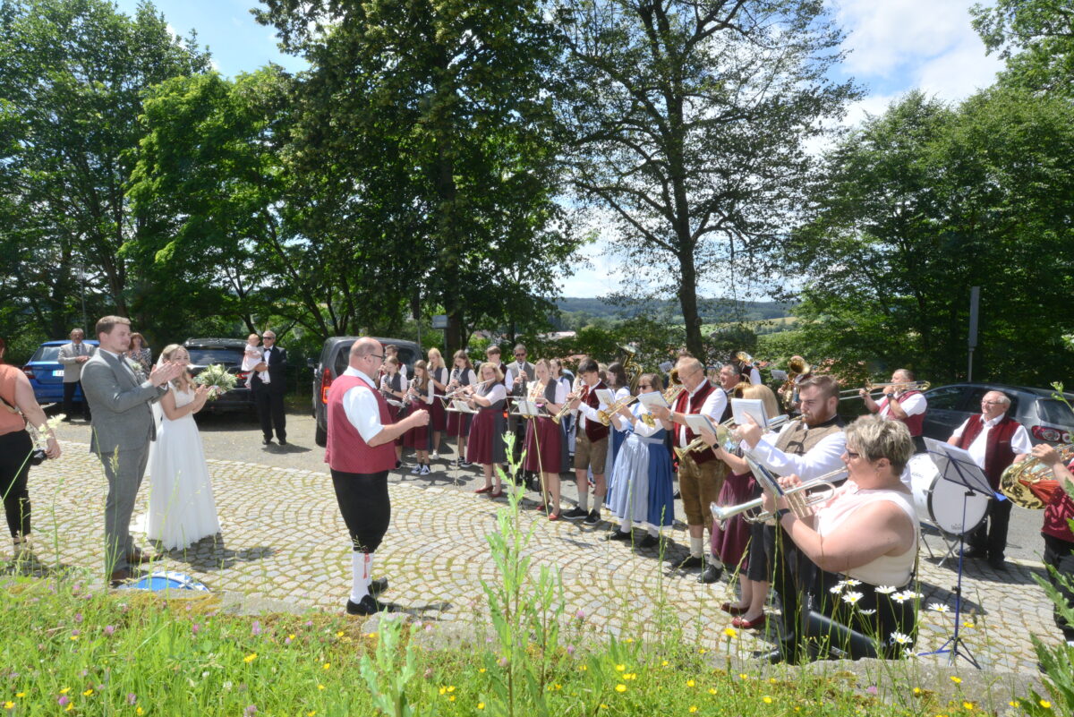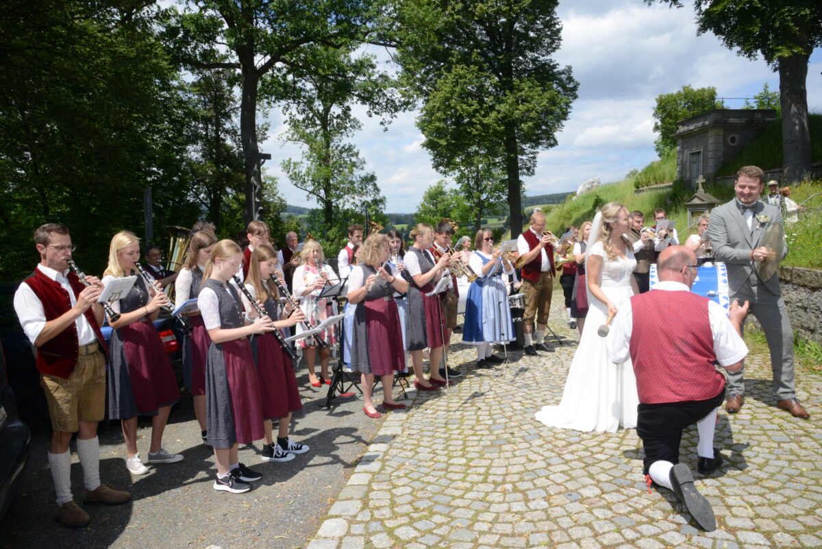 Am Samstag bei der kirchlichen Trauung in der Kreuzbergkirche erklang festliche und auch moderne Musik. Die Musikkameraden des Bräutigams von der „Rüscherl Muse“ und den „Werkstattmusikanten Eslarn“ begeisterten Brautpaar und Hochzeitsgäste gleichermaßen, was der bis aufs Plateau zu hörende Applaus auch bestätigte.