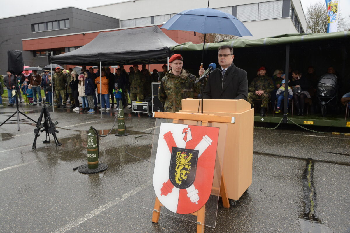 Die vierte Batterie nutzte diesen Appell, um der Bevölkerung Windischeschenbachs modernste Waffen der Bundeswehr zu zeigen. Pünktlich zum Beginn des Appells auf dem Parkplatz vor der Mehrzweckhalle, setzte der Regen ein. Bataillonskommandeur Oberstleutnant Thorsten Wallschuss freute sich in seinem Willkommensgruß über die Vielzahl der Gäste, insbesondere derer, die dafür weite Wege in Kauf genommen haben.