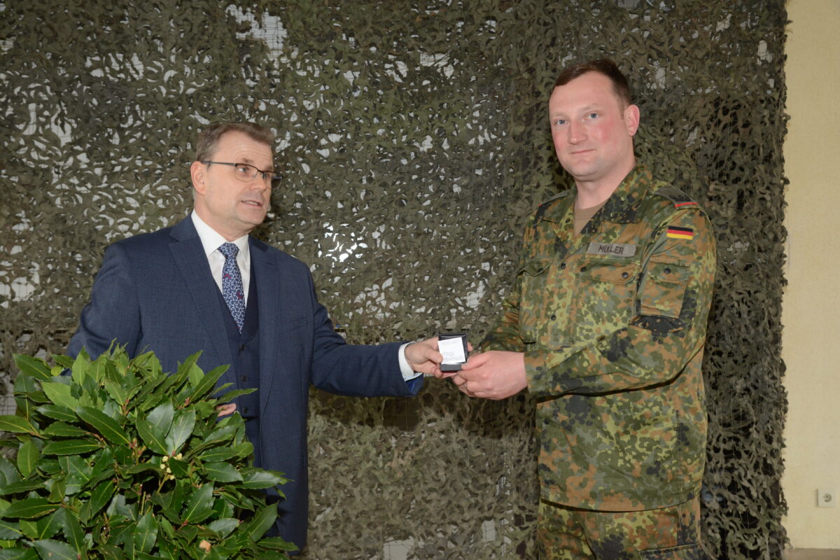 Im Anschluss an die Ansprache des Bürgermeisters vor den angetretenen Soldaten der vierten Batterie erfolgte die Übergabe der Standarte vom ausscheidenden Batteriechef zunächst an Bataillonskommandeur Oberstleutnant Thorsten Wallschuss und dann an Hauptmann Christian Knorn als Nachfolger Müllers. Oberstleutnant Thorsten Wallschuss sprach dann ausführlich die Einsätze der vierten Batterie in der Dienstzeit von Major Johannes Müller an, die vor allem auch von der Coronaproblematik geprägt war. Nach dem Abspielen des Bayernliedes und der Nationalhymne dann eine ganz besondere Ehrung für Major Johannes Müller.