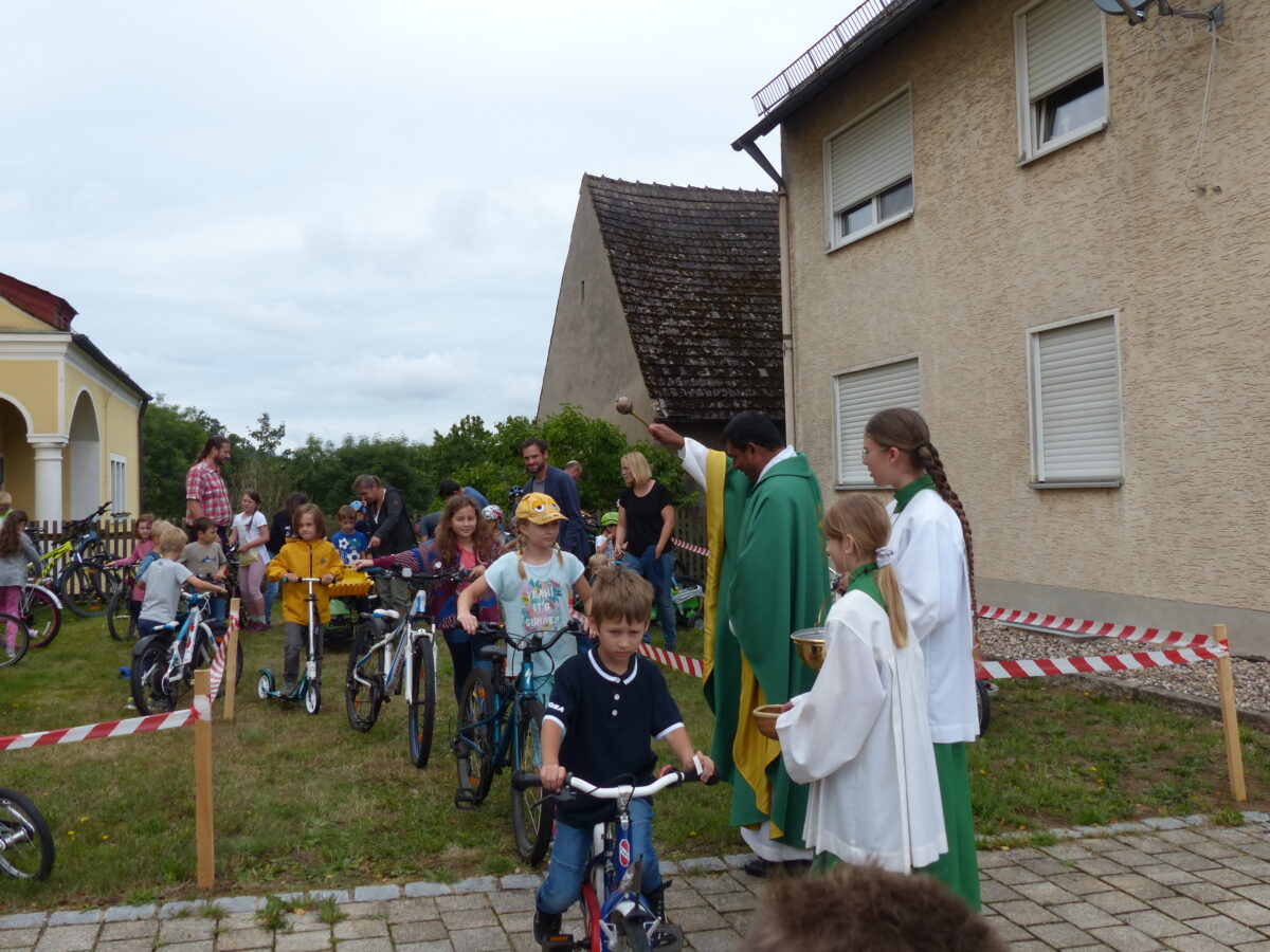 Der Heilige Christopherus gilt landläufig als Schutzpatron der Reisenden. Fahrzeuge werden schon immer mit dem Segen geschützt. In Kohlberg segnete der Pater Prince Joseph Kalarimuriyil die Fahrzeuge der Kinder. Von Inlinern über Tretbulldog bis hin zum Fahrrad war alles dabei.