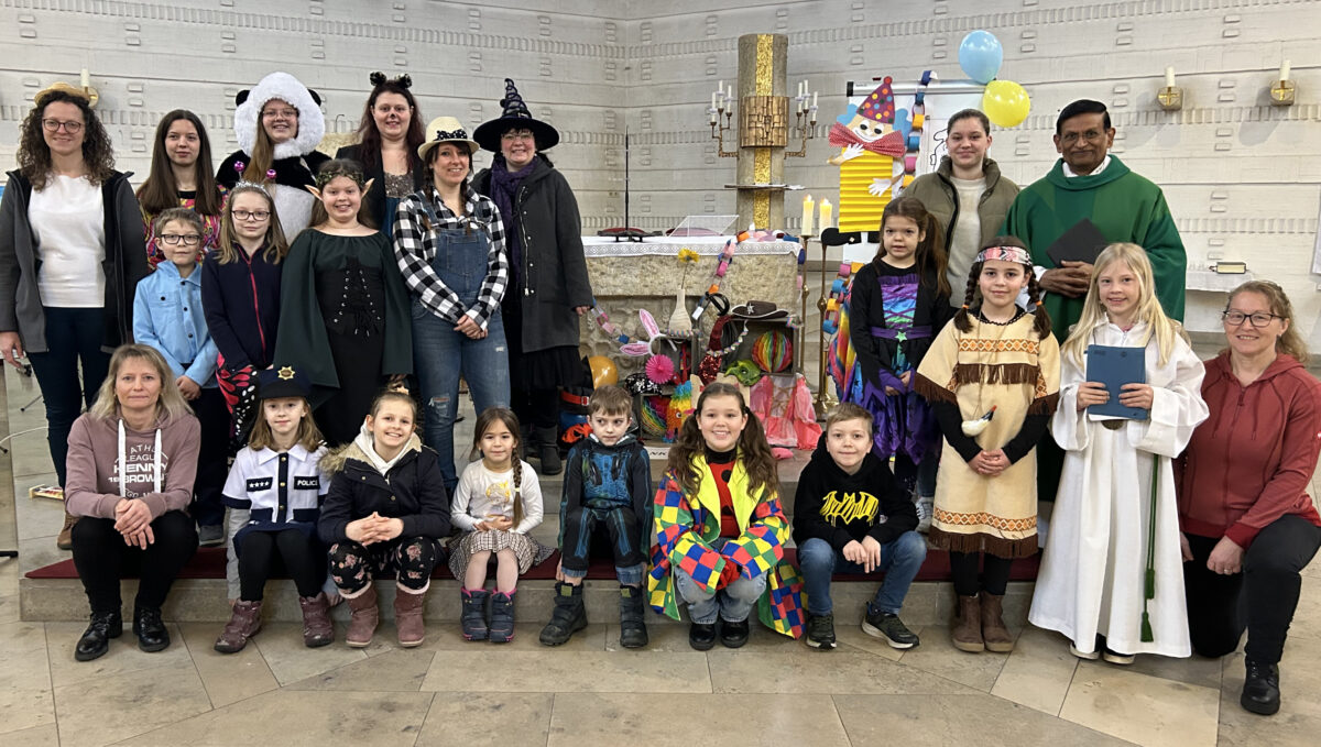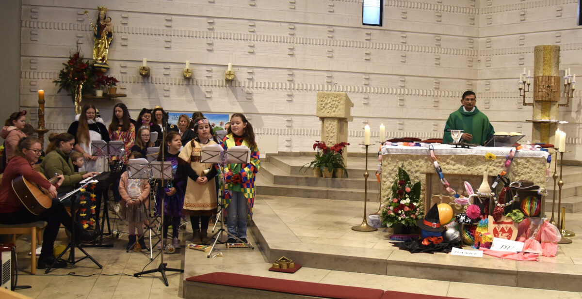 „Wir fangen an fröhlich zu sein, wir dürfen von Herzen uns freuen“, erklang es fröhlich. Fröhlich, lustig und stimmungsvoll, aber auch nachdenklich waren die in die Eucharistiefeier eingebauten Aktionen. Hauptakteure waren die Kinder des Kindersingkreises. Nach dem Motto „Wenn du fröhlich bist“ bewiesen sie mit Rollenspielen, Fürbitten in Aktionen, dass Beten nicht nur ernst, sondern auch fröhlich sein kann. Die Lieder luden zum Singen, Tanzen und Bewegen ein.
