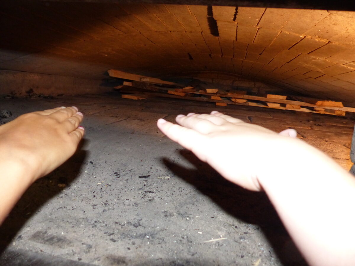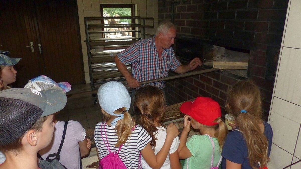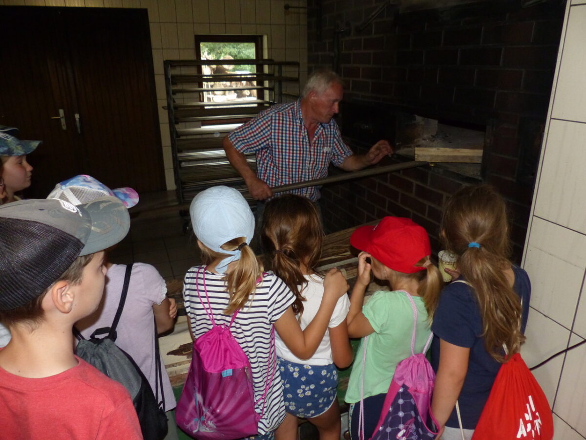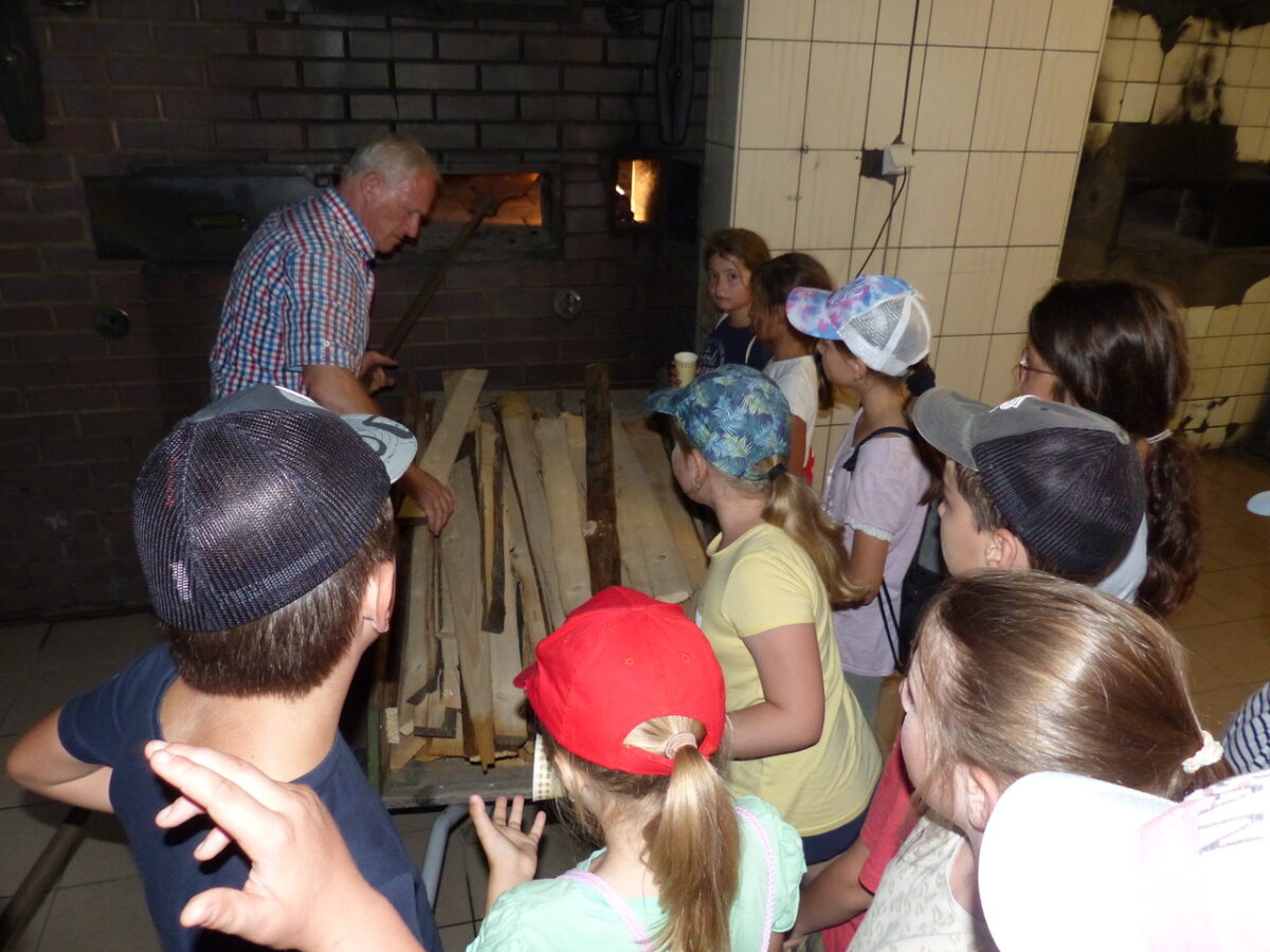 Anschließend ging es weiter in die Backstube und hier bestückte der Bäckermeister Lindner den Backofen mit den Brettern aus dem Sägewerk. Nach dem richtigen Aufheizen können 70 Laib Brot auf einmal gebacken werden. Die Kinder konnten, bevor er anheizte, im Backofen die Wärme testen, die vom frühen Morgen noch vorhanden war, und alle stecken kurz ihre Hand rein.