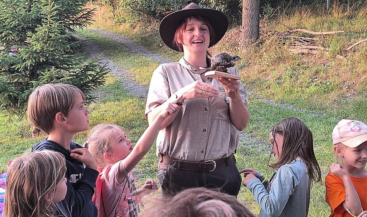 Anschließend brach die Gruppe mit rund 20 Kindern im Alter von sechs bis zehn Jahren entlang des Panoramawegs auf. Gespannt lauschten die Kinder den Erzählungen von Rangerin Griener, die nicht nur über nachtaktive Tiere berichtete, sondern auch Pflanzen wie das geheimnisvolle Hexenkraut oder die Brennnessel erklärte.