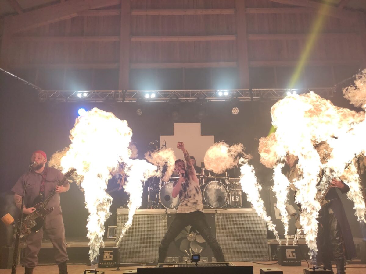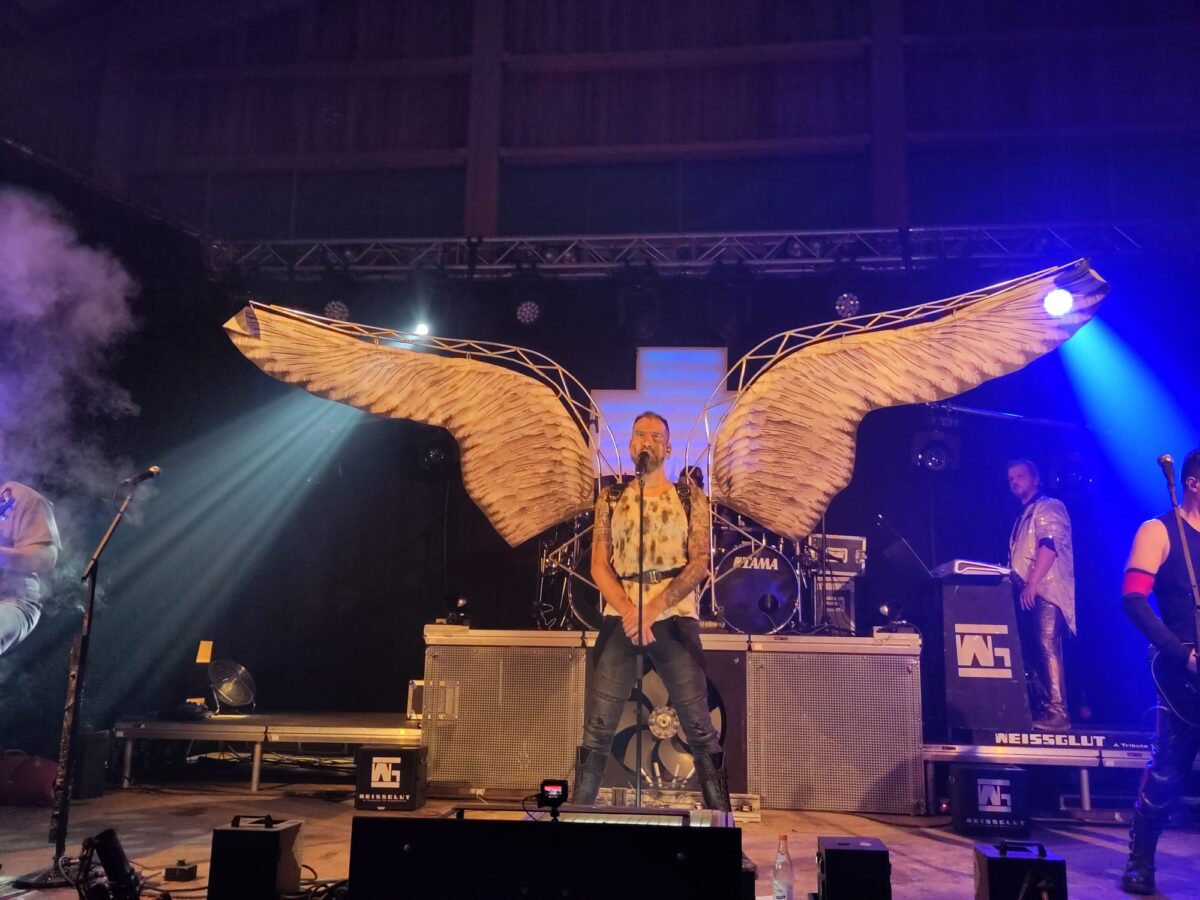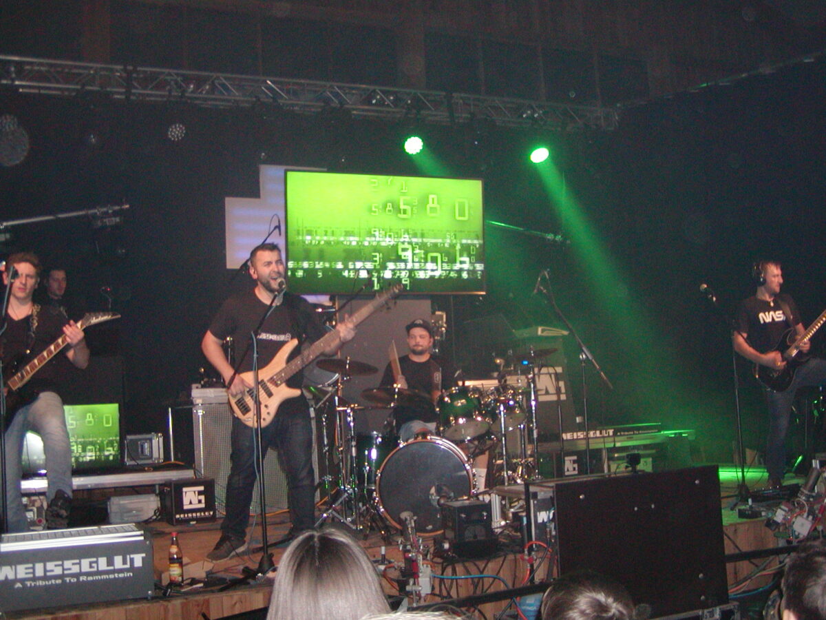 Ein Feuerwerk entzündete anschließend „Weissglut“. Die pyrotechnischen Effekte wie Bühnenblitze, bengalische Feuer, Fontänen, Flammensäulen und Nebelmaschinen kamen zeitgerecht zum Einsatz bei bekannten Hits wie „Sonne“, „Engel“ oder „Dicke Titten“. Frontmann Chris Sander begeisterte die 600 Besucher mit seiner Stimme und ließ an das Original Till Lindemann dauerhaft erinnern. Nicht umsonst feiern sie nächstes Jahr ihr 20-jähriges Bühnenjubiläum.
