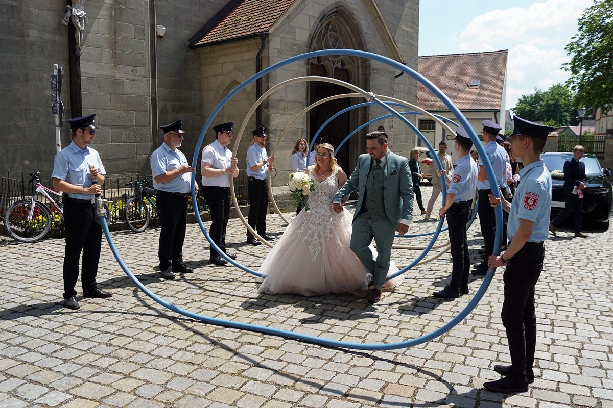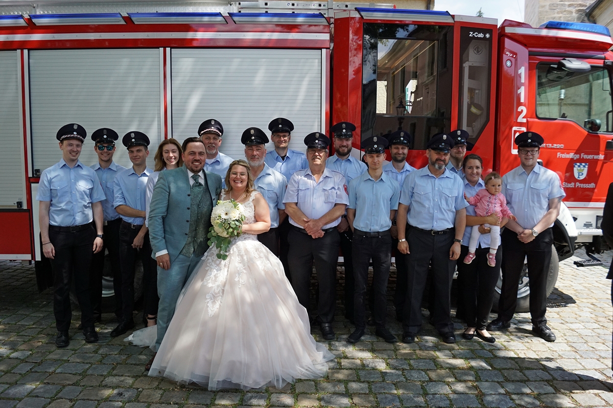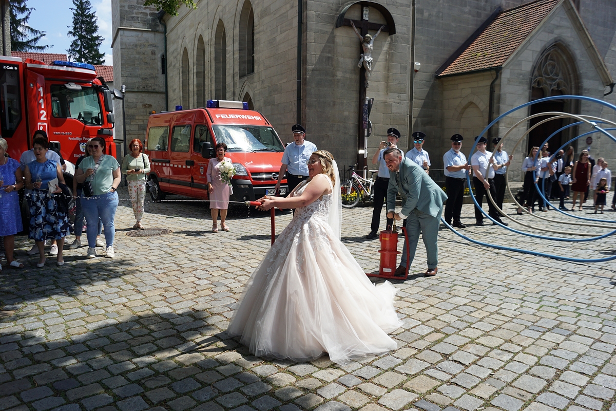 Neben den Arbeitskollegen von Marina, einer CSU Abordnung und auch den Pferdefreunden warteten auch die Kameraden der Freiwilligen Feuerwehr Pressath auf ihren Floriansjünger. So durfte das Brautpaar auch eine gemeinsame Aufgabe erfüllen, bevor der Durst gelöscht wurde.