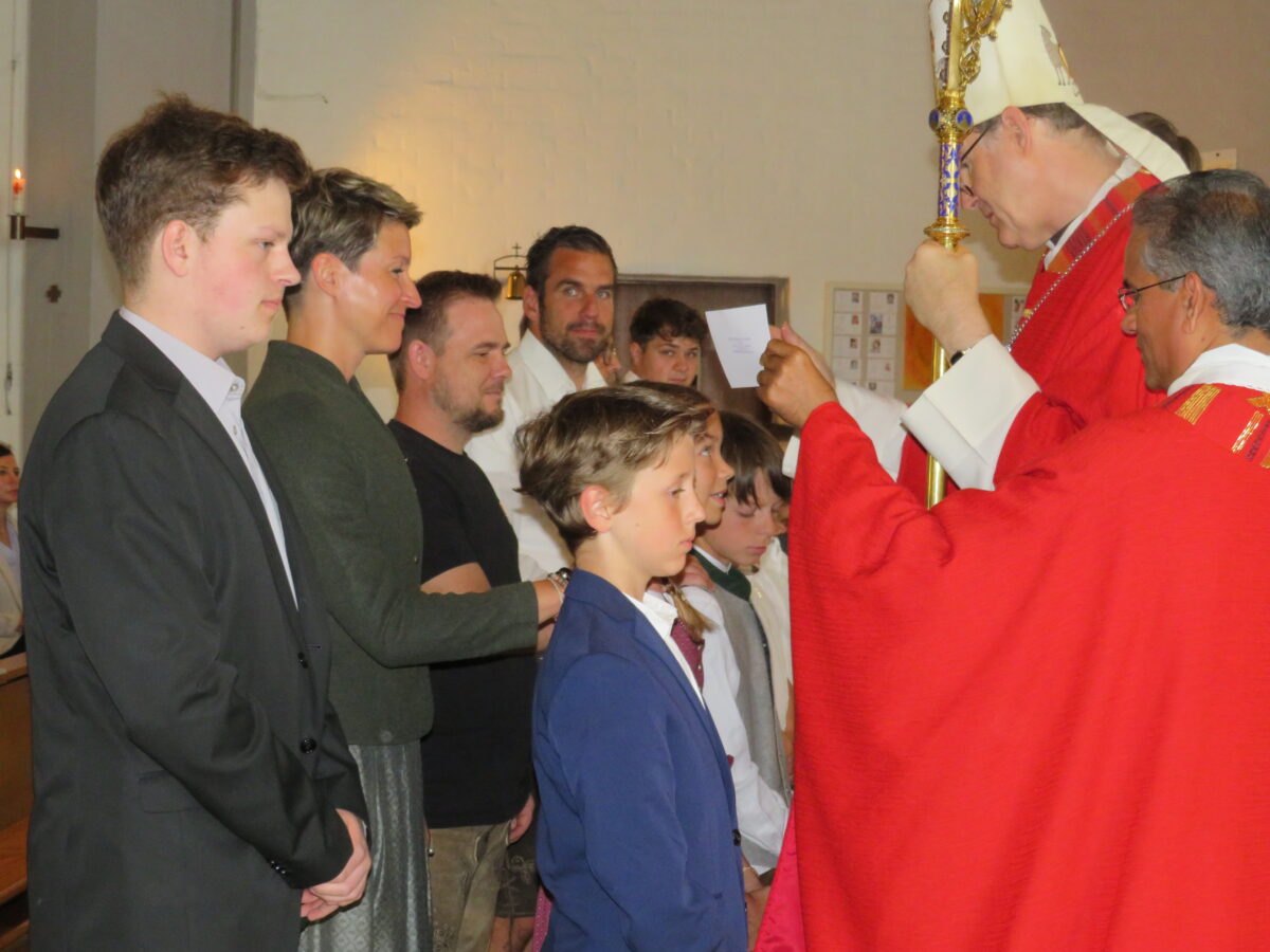 Thomas Kopp begrüßte die Firmlinge und ihre Familien. “Dieser Tag wird für die Kinder unvergesslich und prägt sich in die Seelen ein. Ich, bringe euch ein Geschenk, von Jesus im Namen unseres Bischofs”, leitete der Weihbischof die Festmesse ein. In der Predigt brachte Josef Graf den Kindern den „Empfang des Heiligen Geist“ in der Firmung und die göttliche Dreifaltigkeit mit sehr persönlichen Worten näher.